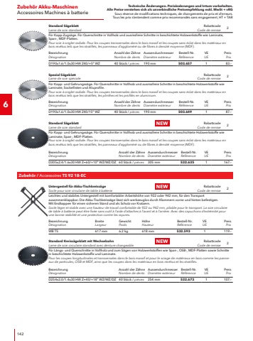 Technische %u00c4nderungen. Preis%u00e4nderungen und Irrtum vorbehalten.Alle Preise verstehen sich als unverbindliche Preisempfehlung exkl. MwSt + vRGSous r%u00e9serve de modifications techniques, de changements de prix et d%u2019erreurs. Tous les prix s%u2018entendent comme prix recommand%u00e9s sans engagement, HT + TAR465Zubeh%u00f6r S%u00e4genAccessoires SciesZubeh%u00f6r S%u00e4bels%u00e4gen / Accessoires Scies sabresS%u00e4bels%u00e4gebl%u00e4tter f%u00fcr Metall und BlechLames de scie sabre pour m%u00e9taux et t%u00f4leRabattcodeCode de remise12S%u00e4bels%u00e4geblatt f%u00fcr Schnitte von 2-8 mm in rostfreien Stahl, Metall/Stahl, Stahlbleche, Stahlrohre, offene/geschlossene Profile.Lame de scie-sabre pour des coupes de 2 %u00e0 8 mm dans l%u2019acier inoxydable, le m%u00e9tal/l%u2019acier, les t%u00f4les d%u2019acier, les tubes d%u2019acier, les profil%u00e9s ouverts/ferm%u00e9s.BezeichnungD%u00e9signationZ%u00e4hne pro ZollDents par pouceL%u00e4ngeLongueurBestell-Nr.R%u00e9f%u00e9renceVEUEPreis PrixRS/BI-150 14 VE514\150 mm462.055520.%u2013S%u00e4bels%u00e4gebl%u00e4tter f%u00fcr Metall und BlechLames de scie sabre pour m%u00e9taux et t%u00f4leRabattcodeCode de remise12S%u00e4bels%u00e4geblatt f%u00fcr Schnitte von 1,5-3 mm in rostfreien Stahl, Metall/Stahl, Stahlbleche, Stahlrohre, offene/geschlossene Profile.Lame de scie-sabre pour des coupes de 1,5 %u00e0 3 mm dans l%u2019acier inoxydable, le m%u00e9tal/l%u2019acier, les t%u00f4les d%u2019acier, les tubes d%u2019acier, les profil%u00e9s ouverts/ferm%u00e9s.BezeichnungD%u00e9signationZ%u00e4hne pro ZollDents par pouceL%u00e4ngeLongueurBestell-Nr.R%u00e9f%u00e9renceVEUEPreis PrixRS/BI-150 18 VE518\150 mm462.063520.%u2013S%u00e4bels%u00e4gebl%u00e4tter f%u00fcr Metall und BlechLames de scie sabre pour m%u00e9taux et t%u00f4leRabattcodeCode de remise12S%u00e4bels%u00e4geblatt f%u00fcr Schnitte von 2-8 mm in Metall/Stahl, Stahlbleche, Stahlrohre, offene/geschlossene Profile sowie f%u00fcr Schnitte in Holz/Palettenbau von 3-180 mm.Lame de scie-sabre pour des coupes de 2 %u00e0 8 mm dans le m%u00e9tal/l%u2019acier, les t%u00f4les d%u2019acier, les tubes d%u2019acier, les profil%u00e9s ouverts/ferm%u00e9s ainsi que pour des coupes dans le bois/bois de palette de 3 %u00e0 180 mm.BezeichnungD%u00e9signationZ%u00e4hne pro ZollDents par pouceL%u00e4ngeLongueurBestell-Nr.R%u00e9f%u00e9renceVEUEPreis PrixRS/BI-230 14 VE514\230 mm462.071524.%u2013S%u00e4bels%u00e4gebl%u00e4tter f%u00fcr Metall, Holz, KunststoffeLames de scie-sabre pour m%u00e9tal, bois, plastiquesRabattcodeCode de remise12S%u00e4bels%u00e4geblatt f%u00fcr Schnitte von 6-100 mm in MDF, Holz mit N%u00e4geln, f%u00fcr Altbausanierung/Fensterrahmen, Metall/Stahl, faserverst%u00e4rkte Kunststoffe/Epoxy, Kurvenschnitte.Lame de scie-sabre pour des coupes de 6 %u00e0 100 mm dans le MDF, le bois clout%u00e9, pour la r%u00e9novation de b%u00e2timents anciens/les ch%u00e2ssis de fen%u00eatre, le m%u00e9tal/l%u2019acier, les plastiques renforc%u00e9s par des fibres/l%u2019%u00e9poxy, les coupes curvilignes.BezeichnungD%u00e9signationZ%u00e4hne pro ZollDents par pouceL%u00e4ngeLongueurBestell-Nr.R%u00e9f%u00e9renceVEUEPreis PrixRS/BI-150 6 VE56\150 mm462.098524.%u2013S%u00e4bels%u00e4gebl%u00e4tter f%u00fcr Metall, Holz, KunststoffeLames de scie-sabre pour m%u00e9tal, bois, plastiquesRabattcodeCode de remise12S%u00e4bels%u00e4geblatt f%u00fcr Schnitte von 3-100 mm in Holz mit N%u00e4geln, faserverst%u00e4rkte Kunststoffe/Epoxy, sowie f%u00fcr Schnitte von 3-12 mm in rostfreien Stahl, Metall/Stahl, Stahlrohre.Lame de scie-sabre pour des coupes de 3 %u00e0 100 mm dans le bois clout%u00e9, les plastiques renforc%u00e9s par des fibres/l%u2019%u00e9poxy, ainsi que pour des coupes de 3 %u00e0 12 mm dans l%u2019acier inoxydable, le m%u00e9tal/l%u2019acier, les tubes d%u2019acier.BezeichnungD%u00e9signationZ%u00e4hne pro ZollDents par pouceL%u00e4ngeLongueurBestell-Nr.R%u00e9f%u00e9renceVEUEPreis PrixRS/BI-150 10 VE510\150 mm462.101520.%u2013S%u00e4bels%u00e4gebl%u00e4tter f%u00fcr Metall, Holz, KunststoffeLames de scie-sabre pour m%u00e9tal, bois, plastiquesRabattcodeCode de remise12S%u00e4bels%u00e4geblatt f%u00fcr Schnitte von 3 %u2013 190 mm in Holz mit N%u00e4geln, Palettenbau, faserverst%u00e4rkte Kunststoffe/Epoxy, sowie f%u00fcr Schnitte von 3 %u2013 12 mm in Metall/Stahl, Stahlrohre.Lame de scie sabre pour les coupes de 3 %u00e0 190 mm dans le bois avec clous, la construction de palettes, les plastiques renforc%u00e9s de fibres/%u00e9poxy, ainsi que pour les coupes de 3 %u00e0 12 mm dans le m%u00e9tal/l%u2018acier, les tubes d%u2018acier.BezeichnungD%u00e9signationZ%u00e4hne pro ZollDents par pouceL%u00e4ngeLongueurBestell-Nr.R%u00e9f%u00e9renceVEUEPreis PrixRS/BI-230 10 VE510\230 mm462.128527.%u2013