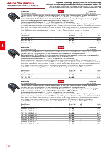 Technische %u00c4nderungen. Preis%u00e4nderungen und Irrtum vorbehalten.Alle Preise verstehen sich als unverbindliche Preisempfehlung exkl. MwSt + vRGSous r%u00e9serve de modifications techniques, de changements de prix et d%u2019erreurs. Tous les prix s%u2018entendent comme prix recommand%u00e9s sans engagement, HT + TAR566Akku-MaschinenMachines %u00e0 batterieTechnische DatenAkku-Spannung12VAkku-Kapazit%u00e4t2.5 / 5.0 AhNennkraft19 kNMax. Pressbereich Metall35 mmMax. Pressbereich Kunststoff40 mmAbmessung LxBxH332 x 75 x 88 mmGewicht ohne Akkupack1.58 kgCaract%u00e9ristiques techniquesTension de batterie12VCapacit%u00e9 de batterie2.5 / 5.0 AhForce nominale19 kNPlage de pressage max. m%u00e9tal35 mmPlage de pressage max. plastique40 mmDimension LxlxH332 x 75 x 88 mmPoids sans batterie1.58 kgPP 40 12Bestell-Nr.R%u00e9f%u00e9renceGTINRabattcodeCode de remisePreisPrixAkku-Rohrpresse 12V Presse %u00e0 tube %u00e0 batterie 12V534.221403029328061811%u2018625.%u2013 exkl. MwSt. hors TVA 0.56 vRGTARNEWLieferumfang1x Koffereinlage534.3351x Transportkoffer L-BOXX%u00ae534.215Equipement de base1x insert pour coffret534.3351x coffret de transport L-BOXX%u00ae534.215Technische DatenAkku-Spannung12VAkku-Kapazit%u00e4t2.5 / 5.0 AhNennkraft19 kNMax. Pressbereich Metall35 mmMax. Pressbereich Kunststoff40 mmAbmessung LxBxH332 x 75 x 88 mmGewicht ohne Akkupack1.58 kgCaract%u00e9ristiques techniquesTension de batterie12VCapacit%u00e9 de batterie2.5 / 5.0 AhForce nominale19 kNPlage de pressage max. m%u00e9tal35 mmPlage de pressage max. plastique40 mmDimension LxlxH332 x 75 x 88 mmPoids sans batterie1.58 kgPP 40 12/2.5 SetBestell-Nr.R%u00e9f%u00e9renceGTINRabattcodeCode de remisePreisPrixAkku-Rohrpresse 12V Presse %u00e0 tube %u00e0 batterie 12V534.222403029328062511%u2018725.%u2013 exkl. MwSt. hors TVA 2.16 vRGTARNEWLieferumfang1x Akku AP 12/2.5 Ah532.2901x Schnellladeger%u00e4t CA 12532.2861x Koffereinlage534.3351x Transportkoffer L-BOXX%u00ae534.215Equipement de base1x batterie AP 12/2.5 Ah532.2901x chargeur rapide CA 12532.2861x insert pour coffret534.3351x coffret de transport L-BOXX%u00ae534.215