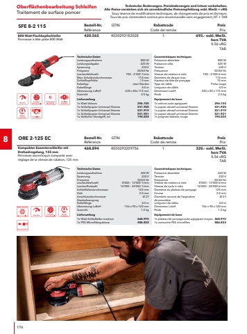 Technische %u00c4nderungen. Preis%u00e4nderungen und Irrtum vorbehalten.Alle Preise verstehen sich als unverbindliche Preisempfehlung exkl. MwSt + vRGSous r%u00e9serve de modifications techniques, de changements de prix et d%u2019erreurs. Tous les prix s%u2018entendent comme prix recommand%u00e9s sans engagement, HT + TAR12WinkelschleiferMeuleses d%u2018angle2Technische DatenLeistungsaufnahme1500 WLeistungsabgabe960 WSpannung230 VFrequenz50/60 HzMax. Scheibendurchmesser125 mmLeerlaufdrehzahl11%u2018500 1/minWerkzeugaufnahmeM14Kabell%u00e4nge4.0 mAbmessung LxBxH310 x 75 x 105 mmGewicht2.3 kgLieferumfang1x Schutzhaube Schleifen436.8601x SoftVib-Handgriff530.9031x Spannflansch335.2821x Spannmutter M14100.080Caract%u00e9ristiques techniquesPuissance absorb%u00e9e1500 WPuissance utile960 WTension230 VFr%u00e9quence50/60 HzDiam%u00e8tre de disque max.125 mmVitesse de rotation %u00e0 vide11%u2018500 tr/minEmmanchementM14Longueur de c%u00e2ble4.0 mDimension LxlxH310 x 75 x 105 mmPoids2.3 kgEquipement de base1x carter de protection du pon%u00e7age436.8601x poign%u00e9e SoftVib530.9031x bride de serrage335.2821x ecrou de serrage M14100.080L 15-11 125Bestell-Nr.R%u00e9f%u00e9renceGTINRabattcodeCode de remisePreisPrix1500 Watt Winkelschleifer, 125 mmMeuleuse d%u2018angle 1500 Watt, 125 mm447.69240302931973121215.%u2013 exkl. MwSt. hors TVA 0.56 vRGTARTechnische DatenLeistungsaufnahme1500 WLeistungsabgabe960 WSpannung230 VFrequenz50/60 HzMax. Scheibendurchmesser125 mmLeerlaufdrehzahl2%u2018800 %u201311%u2018500 1/minWerkzeugaufnahmeM14Kabell%u00e4nge4.0 mAbmessung LxBxH310 x 75 x 105 mmGewicht2.3 kgLieferumfang1x Schutzhaube Schleifen436.8601x SoftVib-Handgriff530.9031x Spannflansch335.2821x Spannmutter M14100.080Caract%u00e9ristiques techniquesPuissance absorb%u00e9e1500 WPuissance utile960 WTension230 VFr%u00e9quence50/60 HzDiam%u00e8tre de disque max.125 mmVitesse de rotation %u00e0 vide2%u2018800 %u2013 11%u2018500 tr/minEmmanchementM14Longueur de c%u00e2ble4.0 mDimension LxlxH310 x 75 x 105 mmPoids2.3 kgEquipement de base1x carter de protection du pon%u00e7age436.8601x poign%u00e9e SoftVib530.9031x bride de serrage335.2821x ecrou de serrage M14100.080LE 15-11 125Bestell-Nr.R%u00e9f%u00e9renceGTINRabattcodeCode de remisePreisPrix1500 Watt Winkelschleifer mitvariabler Drehzahl, 125 mmMeuleuse d%u2018angle 1500 Watt %u00e0 vitessede rotation variable, 125 mm447.72240302931973291240.%u2013 exkl. MwSt. hors TVA 0.56 vRGTAR