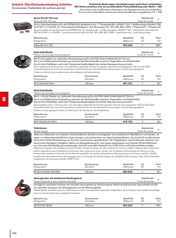 Technische %u00c4nderungen. Preis%u00e4nderungen und Irrtum vorbehalten.Alle Preise verstehen sich als unverbindliche Preisempfehlung exkl. MwSt + vRGSous r%u00e9serve de modifications techniques, de changements de prix et d%u2019erreurs. Tous les prix s%u2018entendent comme prix recommand%u00e9s sans engagement, HT + TAR22Zubeh%u00f6r WinkelschleiferAccessoires Meuleses d%u2018angle2Stirnlochschl%u00fcssel / Cl%u00e9 %u00e0 ergotsStirnlochschl%u00fcsselCl%u00e9 %u00e0 ergotsRabattcodeCode de remise3BezeichnungD%u00e9signationBestell-Nr.R%u00e9f%u00e9renceVEUEPreis PrixStirnlochschl%u00fcssel / Cl%u00e9 %u00e0 ergots100.11019.%u2013Handgriffe / Poign%u00e9eSoftVib-HandgriffPoign%u00e9e SoftVibRabattcodeCode de remise2BezeichnungD%u00e9signationBestell-Nr.R%u00e9f%u00e9renceVEUEPreis PrixGS-SPV M8530.903113.%u2013SoftVib-HandgriffPoign%u00e9e SoftVibRabattcodeCode de remise2BezeichnungD%u00e9signationBestell-Nr.R%u00e9f%u00e9renceVEUEPreis PrixGS-M M8 SV325.376113.%u2013SoftVib-HandgriffPoign%u00e9e SoftVibRabattcodeCode de remise2BezeichnungD%u00e9signationBestell-Nr.R%u00e9f%u00e9renceVEUEPreis PrixGS-M M14 SV325.384115.%u2013Seitlicher HandgriffPoign%u00e9e lat%u00e9raleRabattcodeCode de remise3BezeichnungD%u00e9signationBestell-Nr.R%u00e9f%u00e9renceVEUEPreis PrixGS-HP M8462.98519.50Seitlicher HandgriffPoign%u00e9e lat%u00e9raleRabattcodeCode de remise3BezeichnungD%u00e9signationBestell-Nr.R%u00e9f%u00e9renceVEUEPreis PrixGS-HP M10514.45419.50Seitlicher HandgriffPoign%u00e9e lat%u00e9raleRabattcodeCode de remise2BezeichnungD%u00e9signationBestell-Nr.R%u00e9f%u00e9renceVEUEPreis PrixGS-HP M10 SW533.10617.%u2013