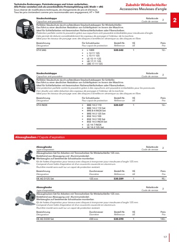 Elektrowerkzeuge f%u00fcr ProfisOutils %u00e9lectroniques pour les professionels1Schweizer SpezialistenSp%u00e9cialistes suissesSeite / Page 310SpezialmaschinenMachines sp%u00e9cialesSeite / Page 2132WinkelschleiferMeuleuse d%u2018angleSeite / Page 93GeradschleiferMeuleuse droiteSeite / Page 234Metalloberfl%u00e4chen-BearbeitungTraitement des surfaces m%u00e9talliquesSeite / Page 255S%u00e4genSciesSeite / Page 436Akku-MaschinenMachines %u00e0 batterieSeite / Page 497Wand- und DeckenschleiferPonceuse pour murs et plafondsSeite / Page 1558Oberfl%u00e4chenbearbeitung SchleifenTraitement de surface poncerSeite / Page 1739SanierungsmaschinenMachines de r%u00e9novationSeite / Page 19111Bohrh%u00e4mmerMarteaux perforateursSeite / Page 21512IndustriesaugerAspirateur de securit%u00e9Seite / Page 22513Bau-Luftreiniger%u00c9purateur d%u2018air de chantierSeite / Page 24514R%u00fchrwerkeM%u00e9langeurSeite / Page 24915Messtechnik / LaserMat%u00e9riel de mesure / LaserSeite / Page 25516PoliererPolisseuseSeite / Page 26117SteinbearbeitungTravail de la pierreSeite / Page 27718TransportkoffersystemSyst%u00e8me de mallettes de transportSeite / Page 285