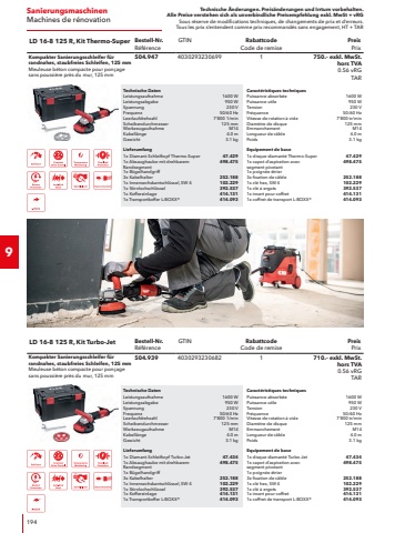 Technische %u00c4nderungen. Preis%u00e4nderungen und Irrtum vorbehalten.Alle Preise verstehen sich als unverbindliche Preisempfehlung exkl. MwSt + vRGSous r%u00e9serve de modifications techniques, de changements de prix et d%u2019erreurs. Tous les prix s%u2018entendent comme prix recommand%u00e9s sans engagement, HT + TAR304Metalloberfl%u00e4chen-BearbeitungTraitement de surface m%u00e9talliqueTechnische DatenLeistungsaufnahme1400 WLeistungsabgabe880 WSpannung230 VFrequenz50/60 HzB%u00fcrsten-/Walzendurchmesser Max.125 mmB%u00fcrsten-/Walzenbreite Max.100 mmLeerlaufdrehzahl1%u2018000 %u2013 3%u2018500 1/minWerkzeugaufnahme19 mmKabell%u00e4nge4.0 mAbmessung LxBxH320 x 210 x 195 mmGewicht2.9 kgLieferumfang1x Schleifvorsatz Rohrband433.4701x Schleifvorsatz Satinieren433.4621x Gummiluftwalze433.8961x Luftpumpe256.2841x Superfinishing-Band326.9171x Superfinishing-Band326.9331x Schleifband MESHFLEX326.8791x Schleifband MESHFLEX326.8525x Schleifband CORUFLEX326.7395x Schleifband CORUFLEX326.7555x Schleifband CORUFLEX434.9141x Koffereinlage433.9181x Transportkoffer L-BOXX%u00ae414.093Caract%u00e9ristiques techniquesPuissance absorb%u00e9e1400 WPuissance utile880 WTension230 VFr%u00e9quence50/60 HzDiam%u00e8tre de brosse125 mmLargeur de brosse100 mmVitesse de rotation %u00e0 vide1%u2018000 %u2013 3%u2018500 tr/minEmmanchement19 mmLongueur de c%u00e2ble4.0 mDimension LxlxH320 x 210 x 195 mmPoids2.9 kgEquipement de base1x adaptateurdepon%u00e7age%u00e0bandepourtubes433.4701x adaptateur de pon%u00e7age pour satinage433.4621x cylinde %u00e0 air en caoutchouc433.8961x pompe d%u2018air256.2841x bande de polissage velcro finition326.9171x bande de polissage velcro finition326.9331x bande abrasive MESHFLEX326.8791x bande abrasive MESHFLEX326.8525x bande abrasive CORUFLEX326.7395x bande abrasive CORUFLEX326.7555x bande abrasive CORUFLEX434.9141x insert pour coffret433.9181x coffret de transport L-BOXX%u00ae414.093BSE 14-3 INOX SetBestell-Nr.R%u00e9f%u00e9renceGTINRabattcodeCode de remisePreisPrixSatiniermaschine und Rohrbandschleifer TRINOXFLEX im SetSatineuseet ponceuse %u00e0 bande pour tubes TRINOXFLEX en set433.454403029318720711%u2018520.%u2013 exkl. MwSt. hors TVA 0.56 vRGTAR