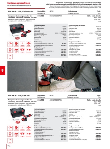 Technische %u00c4nderungen. Preis%u00e4nderungen und Irrtum vorbehalten.Alle Preise verstehen sich als unverbindliche Preisempfehlung exkl. MwSt + vRGSous r%u00e9serve de modifications techniques, de changements de prix et d%u2019erreurs. Tous les prix s%u2018entendent comme prix recommand%u00e9s sans engagement, HT + TAR324Zubeh%u00f6r Metalloberfl%u00e4chen-BearbeitungAccessoires Traitement de surface m%u00e9talliqueZubeh%u00f6r / Accessoires TRINOXFLEX / BSE / BRE / BBE 14-3Schleifvorsatz SatinierenAdaptateur de pon%u00e7age pour satinageRabattcodeCode de remise2Schleifvorsatz mit integriertem Handgriff zum Satinieren f%u00fcr die TRINOXFLEX. Werkzeuglos %u00fcber das Schnellwechselsystem montierbar.Adaptateur de pon%u00e7age avec poign%u00e9e int%u00e9gr%u00e9e pour la satineuse TRINOXFLEX. Montage possible sans outil via le syst%u00e8me de changement rapide.BezeichnungD%u00e9signationBestell-Nr.R%u00e9f%u00e9renceVEUEPreis PrixBS 100433.4621346.%u2013Schleifvorsatz RohrbandAdaptateur de pon%u00e7age %u00e0 bande pour tubesRabattcodeCode de remise2Schleifvorsatz zum Rohrbandschleifen f%u00fcr die TRINOXFLEX.Werkzeuglos %u00fcber das Schnellwechselystem montierbar. Vorsatz variabel verstellbar.Adaptateur de pon%u00e7age %u00e0 des fins de pon%u00e7age %u00e0 bande pour tubes pour TRINOXFLEX. Montage possible sans outil via le syst%u00e8me de changement rapide. Adaptateur %u00e0 r%u00e9glage variable.BezeichnungD%u00e9signationBestell-Nr.R%u00e9f%u00e9renceVEUEPreis PrixBR 125433.47011%u2018050.%u2013Schleifvorsatz B%u00fcrstenAdaptateur de pon%u00e7age brossageRabattcodeCode de remise2Schleifvorsatz zum B%u00fcrsten f%u00fcr die TRINOXFLEX. Mit abnehmbarer Schutzhaube und Absauganschluss %u00d8 32 mm f%u00fcr staubarmes Arbeiten. Inklusive F%u00fchrungsanschlag und vibrationsged%u00e4mpftem ergonomischen Handgriff. Werkzeugloser Schleifwerkzeugwechsel %u00fcber patentiertes Schnellwechselsystem.Adaptateur de pon%u00e7age pour la brosseuse TRINOXFLEX.Avec carter de protection amovible et raccord d%u2019aspiration de 32 mm de diam%u00e8tre pour un travail peu poussi%u00e9reux. Avec but%u00e9e de guidage et poign%u00e9e ergonomique antivibratoire. Changement d%u2019outil de pon%u00e7age sans outil gr%u00e2ce au syst%u00e8me brevet%u00e9 de changement rapide.BezeichnungD%u00e9signationBestell-Nr.R%u00e9f%u00e9renceVEUEPreis PrixBB 110461.5551429.%u2013AbsaughaubeJupe d%u2019aspirationRabattcodeCode de remise2Absaughaube f%u00fcr die BSE 14-3 100 mit Absauganschluss (Clip D32) f%u00fcr Walzen und B%u00fcrsten mit max. %u00d8 110 mm.Capot d%u2019aspiration pour BSE 14-3 100 avec raccord d%u2019aspiration (clip D32) pour rouleaux et brosses avec un diam%u00e8tre max. de 110 mm.BezeichnungD%u00e9signationBestell-Nr.R%u00e9f%u00e9renceVEUEPreis PrixBG D 110461.5471127.%u2013B%u00fcrstenleisteInsertsRabattcodeCode de remise2B%u00fcrstenleiste f%u00fcr Absaughaube 461.547.Barrette %u00e0 brosse pour capot d%u2018aspiration 461.547.BezeichnungD%u00e9signationBestell-Nr.R%u00e9f%u00e9renceVEUEPreis PrixBL-S BG461.563122.%u2013GummiluftwalzeCylindre %u00e0 air en caoutchoucRabattcodeCode de remise2Zum gef%u00fchlvollen Schleifen von Konturen.Pour bien poncer les contours.BezeichnungD%u00e9signationBestell-Nr.R%u00e9f%u00e9renceVEUEPreis PrixAS 100x100433.8961111.%u2013