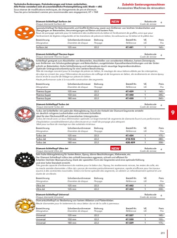 Technische %u00c4nderungen. Preis%u00e4nderungen und Irrtum vorbehalten.Alle Preise verstehen sich als unverbindliche Preisempfehlung exkl. MwSt + vRGSous r%u00e9serve de modifications techniques, de changements de prix et d%u2019erreurs. Tous les prix s%u2018entendent comme prix recommand%u00e9s sans engagement, HT + TAR475Zubeh%u00f6r S%u00e4genAccessoires SciesS%u00e4bels%u00e4gebl%u00e4tter f%u00fcr DemontageLames de scie-sabre pour d%u00e9ment%u00e9lementRabattcodeCode de remise12Demontageblatt f%u00fcr winkelgenaue Schnitte bis 180 mm in Hartholz, MDF, Holz mit N%u00e4geln, f%u00fcr Altbausanierung/Fensterrahmen, faserverst%u00e4rkte Kunststoffe/Epoxy.Lame de d%u00e9ment%u00e9lement pour des coupes angulaires pr%u00e9cises jusqu%u2019%u00e0 180 mm dans le bois dur, le MDF, le bois clout%u00e9, pour la r%u00e9novation de b%u00e2timents anciens/les ch%u00e2ssis de fen%u00eatre, les plastiques renforc%u00e9s par des fibres/l%u2019%u00e9poxy.BezeichnungD%u00e9signationZ%u00e4hne pro ZollDents par pouceL%u00e4ngeLongueurBestell-Nr.R%u00e9f%u00e9renceVEUEPreis PrixRS/BI-230 6 VE56\230 mm462.136540.%u2013S%u00e4bels%u00e4gebl%u00e4tter f%u00fcr D%u00e4mmstoffLames de scie-sabre pour isolantRabattcodeCode de remise12S%u00e4bels%u00e4geblatt f%u00fcr Schnitte in D%u00e4mmstoffe, Mineralwolle, Schaum, Styropor, Styrodur, Leder, Gummi, Papier, Pappe und Teppich.Lame de scie sabre pour des coupes dans du materiel isolant, laine min%u00e9rale, mousse, polystyr%u00e8ne (Styropor, Styrodur), cuir, caouthouc, papier, carton et moquette.BezeichnungD%u00e9signationL%u00e4ngeLongueurBestell-Nr.R%u00e9f%u00e9renceVEUEPreis PrixRS/CV-300 W VE2300 mm462.144240.%u2013S%u00e4bels%u00e4gebl%u00e4tter f%u00fcr HolzLames de scie-sabre pour boisRabattcodeCode de remise12S%u00e4bels%u00e4geblatt f%u00fcr sehr saubere Schnitte von 6-150 mm in Sperrholz, Multiplex/Tischlerplatten, MDF, beschichtete Platten.Lame de scie-sabre pour des coupes bien nettes de 6 %u00e0 150 mm dans le contreplaqu%u00e9, les panneaux de contreplaqu%u00e9 multiplis/panneaux latt%u00e9s, le MDF, les panneaux rev%u00eatus.BezeichnungD%u00e9signationZ%u00e4hne pro ZollDents par pouceL%u00e4ngeLongueurBestell-Nr.R%u00e9f%u00e9renceVEUEPreis PrixRS/CV-230 10 VE210\230 mm462.152244.%u2013S%u00e4bels%u00e4gebl%u00e4tter f%u00fcr PalettenLames de scie-sabre pour palettesRabattcodeCode de remise12S%u00e4bels%u00e4geblatt f%u00fcr Schnitte von 30-100 mm f%u00fcr den Palettenbau.Lame de scie-sabre pour des coupes bien nettes de 6 %u00e0 150 mm dans le contreplaqu%u00e9, les panneaux de contreplaqu%u00e9 multiplis/panneaux latt%u00e9s, le MDF, les panneaux rev%u00eatus.BezeichnungD%u00e9signationZ%u00e4hne pro ZollDents par pouceL%u00e4ngeLongueurBestell-Nr.R%u00e9f%u00e9renceVEUEPreis PrixRS/BI-230 10 VE510\230 mm462.160527.%u2013S%u00e4bels%u00e4geblatt-Sortiment f%u00fcr Kunststoff/Holz/MetallAssortiment de lames de scie sabre pour PVC/Bois/M%u00e9tauxRabattcodeCode de remise12Sortiment bestehend aus: 1 S%u00e4bels%u00e4geblatt f%u00fcr Schnitte von 1,5-3 mm in rostfreien Stahl, Metall/Stahl, Stahlbleche, Stahlrohre, offene/geschlossene Profile. 1 S%u00e4bels%u00e4geblatt f%u00fcr Schnitte von 6-100 mm in MDF, Holz mit N%u00e4geln, f%u00fcr Altbausanierung/Fensterrahmen, Metall/Stahl, faserverst%u00e4rkte Kunststoffe/Epoxy, Kurvenschnitte. 1 S%u00e4bels%u00e4geblatt f%u00fcr Schnitte von 3-190 mm in Holz mit N%u00e4geln, Palettenbau, faserverst%u00e4rkte Kunststoffe/Epoxy, sowie f%u00fcr Schnitte von 3-12 mm in Metall/Stahl, Stahlrohre.Assortiment comprenant : 1 lame de scie-sabre pour des coupes de 1,5 %u00e0 3 mm dans l%u2019acier inoxydable, le m%u00e9tal/l%u2019acier, les t%u00f4les d%u2019acier, les tubes d%u2019acier, les profil%u00e9s ouverts/ferm%u00e9s. 1 lame de scie-sabre pour des coupes de 6 %u00e0 100 mm dans le MDF, le bois clout%u00e9, pour la r%u00e9novation de b%u00e2timents anciens/les ch%u00e2ssis de fen%u00eatre, le m%u00e9tal/l%u2019acier, les plastiques renforc%u00e9s par des fibres/l%u2019%u00e9poxy, les coupes curvilignes. 1 lame de scie-sabre pour des coupes de 3 %u00e0 190 mm dans le bois clout%u00e9, le bois de palette, les plastiques renforc%u00e9s par des fibres/l%u2019%u00e9poxy, ainsi que pour des coupes de 3 %u00e0 12 mm dans le m%u00e9tal/l%u2019acier, les tubes d%u2019acier.BezeichnungD%u00e9signationBestell-Nr.R%u00e9f%u00e9renceVEUEPreis PrixRS/BI Set VE3462.179315.%u2013