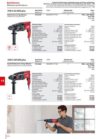 Technische %u00c4nderungen. Preis%u00e4nderungen und Irrtum vorbehalten.Alle Preise verstehen sich als unverbindliche Preisempfehlung exkl. MwSt + vRGSous r%u00e9serve de modifications techniques, de changements de prix et d%u2019erreurs. Tous les prix s%u2018entendent comme prix recommand%u00e9s sans engagement, HT + TAR526Akku-MaschinenMachines %u00e0 batterieTechnische DatenAkku-Spannung12VAkku-Kapazit%u00e4t2.5 / 5.0 AhLeerlaufdrehzahl0 %u2013 3%u2018700 1/minMax. Drehmoment11 NmMax. Schraubendurchmesser4 mmWerkzeugaufnahme1/4\Abmessung LxBxH209 x 66 x 157 mmGewicht ohne Akkupack0.75 kgLieferumfang1x G%u00fcrtelclip1x Bitgarage430.8621x Bithalter395.919Caract%u00e9ristiques techniquesTension de batterie12VCapacit%u00e9 de batterie2.5 / 5.0 AhVitesse de rotation %u00e0 vide0 %u2013 3%u2018700 tr/minCouple max.11 NmDiam%u00e8tre de vis max.4 mmEmmanchement1/4\Dimension LxlxH215x75x203mmPoids sans batterie0.75 kgEquipement de base1x clip ceinture1x stockage bits430.8621x porte bits395.919DW 37 12-EC CBestell-Nr.R%u00e9f%u00e9renceGTINRabattcodeCode de remisePreisPrixAkku-Trockenbauschrauber 12V Visseuse %u00e0 placo %u00e0 batterie12V531.70740302932554701190.%u2013 exkl. MwSt. hors TVA 0.56 vRGTARNEWTechnische DatenAkku-Spannung12VAkku-Kapazit%u00e4t2.5 / 5.0 AhLeerlaufdrehzahl0 %u2013 3%u2018700 1/minMax. Drehmoment11 NmMax. Schraubendurchmesser4 mmWerkzeugaufnahme1/4\Abmessung LxBxH209 x 66 x 157 mmGewicht ohne Akkupack0.75 kgLieferumfang1x G%u00fcrtelclip1x Bitgarage430.8621x Bithalter395.9191x Koffereinlage533.3431x Transportkoffer L-BOXX%u00ae414.085Caract%u00e9ristiques techniquesTension de batterie12VCapacit%u00e9 de batterie2.5 / 5.0 AhVitesse de rotation %u00e0 vide0 %u2013 3%u2018700 tr/minCouple max.11 NmDiam%u00e8tre de vis max.4 mmEmmanchement1/4\Dimension LxlxH215x75x203mmPoids sans batterie0.75 kgEquipement de base1x clip ceinture1x stockage bits430.8621x porte bits395.9191x insert pour coffret533.3431x coffret de transport L-BOXX%u00ae414.085DW 37 12-ECBestell-Nr.R%u00e9f%u00e9renceGTINRabattcodeCode de remisePreisPrixAkku-Trockenbauschrauber 12V Visseuse %u00e0 placo %u00e0 batterie12V531.70840302932554871240.%u2013 exkl. MwSt. hors TVA 0.56 vRGTARNEWTechnische DatenAkku-Spannung12VAkku-Kapazit%u00e4t2.5 / 5.0 AhLeerlaufdrehzahl0 %u2013 810 1/minLeerlaufschlagzahl0 %u2013 4%u2018500 1/minMax. Einzelschlagenergie1.5 JMax. Bohrdurchmesser Beton16 mmWerkzeugaufnahmeSDS-plusAbmessung LxBxH263 x 68 x 190 mmGewicht ohne Akkupack1.68 kgCaract%u00e9ristiques techniquesTension de batterie12VCapacit%u00e9 de batterie2.5 / 5.0 AhVitesse de rotation %u00e0 vide0 %u2013 810 tr/minNombre de coups %u00e0 vide0 %u2013 4%u2018500 tr/minForce de frappe max.1.5 JDiam%u00e8tre de per%u00e7age max. b%u00e9ton16 mmEmmanchementSDS-plusDimension LxlxH263x68x190mmPoids sans batterie1.68 kgFHE 1-16 12-EC CBestell-Nr.R%u00e9f%u00e9renceGTINRabattcodeCode de remisePreisPrixKompakter und leistungsstarkerAkku-Bohrhammer 12V Marteau perforateur %u00e0 batterie12Vcompact et puissant531.70940302932554941225.%u2013 exkl. MwSt. hors TVA 0.56 vRGTARNEWDas passende Zubeh%u00f6r finden Sie ab der Seite 219.Vous trouverez les accessoires correspondants %u00e0 partir de la page 219.