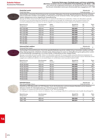 Technische %u00c4nderungen. Preis%u00e4nderungen und Irrtum vorbehalten.Alle Preise verstehen sich als unverbindliche Preisempfehlung exkl. MwSt + vRGSous r%u00e9serve de modifications techniques, de changements de prix et d%u2019erreurs. Tous les prix s%u2018entendent comme prix recommand%u00e9s sans engagement, HT + TAR384Zubeh%u00f6r Metalloberfl%u00e4chen-BearbeitungAccessoires Traitement de surface m%u00e9talliqueSchleifh%u00fclse MESHFLEXManchon abrasif MESHFLEXRabattcodeCode de remise2Zum Entfernen von leichten Besch%u00e4digungen, Kratzern, Anlauffarben, Flugrost, Zunder und Schmutz. Anlauffarben an Schweissn%u00e4hten lassen sich bei d%u00fcnnen Blechen ohne W%u00e4rmeverzug entfernen. Geeignet f%u00fcr Schleif-, Reinigungs- und Finishingarbeiten an Edelstahlstahl, Stahl, Titanlegierungen, Leichtmetallen, Buntmetallen und Kunststoffen.Elimination des petits dommages et des rayures l%u00e9g%u00e8res. Elimination des couleurs de rendu, des couches minces de rouille, des m%u00e2chefers et des salet%u00e9s. Elimination des couleurs de rendu sur les cordons de soudure pour les t%u00f4les minces sans d%u00e9formation sous l%u2019effet de la chaleur. Pour les travaux de pon%u00e7age, nettoyage et finition sur l%u2019acier inoxydable, l%u2019acier, les alliages de titane, les m%u00e9taux l%u00e9gers, les m%u00e9taux non ferreux et les plastiques.BezeichnungD%u00e9signationDurchmesserDiam%u00e8treBreiteLargeurKornGrainBestell-Nr.R%u00e9f%u00e9renceVEUEPreis Prix90x100 ME-A10090 mm100 mmA 100256.288120.%u201390x100 ME-A24090 mm100 mmA 240256.289120.%u201390x100 ME-A40090 mm100 mmA 400256.290120.%u2013100x100 ME-A100100 mm100 mmA 100434.590128.%u2013100x100 ME-A240100 mm100 mmA 240434.604128.%u2013100x100 ME-A400100 mm100 mmA 400434.612128.%u2013Schleifband ZIRCOFLEXBande abrasive ZIRCOFLEXRabattcodeCode de remise9Schleifband mit hochwertigem, selbstsch%u00e4rfendem Zirkonkorund f%u00fcr verl%u00e4ngerte Standzeit. Hohe Abtragsleistung beim Grob- und Zwischenschliff von Stahl- und Edelstahloberfl%u00e4chen.Bande abrasive avec corindon de zirconium de haute qualit%u00e9 %u00e0 auto-aff%u00fbtage pour une plus longue dur%u00e9e de vie. Capacit%u00e9 abrasive %u00e9lev%u00e9e lors du pon%u00e7age grossier et interm%u00e9diaire des surfaces en acier et acier inoxydable.BezeichnungD%u00e9signationBandl%u00e4ngeLongueur de bandeBandbreiteLargeur de bandeKornGrainBestell-Nr.R%u00e9f%u00e9renceVEUEPreis Prix760x40 ZI-P36 VE10760 mm40 mmP 36438.4641055.%u2013760x40 ZI-P40 VE10760 mm40 mmP 40438.4721054.%u2013760x40 ZI-P60 VE10760 mm40 mmP 60438.4801054.%u2013760x40 ZI-P80 VE10760 mm40 mmP 80438.4991048.%u2013760x40 ZI-P120 VE10760 mm40 mmP 120438.5021048.%u2013Schleifband CORUFLEXBande abrasive CORUFLEXRabattcodeCode de remise9Hochflexibles Schleifband mit verg%u00fctetem Korundkorn und schleifaktiven Wirkstoffen f%u00fcr die Edelstahlbearbeitung. Besonders geeignet f%u00fcr den Feinschliff.Bande abrasive ultra souple avec grain corindon tremp%u00e9 et agents abrasifs actifs pour le traitement de l%u2019acier inoxydable. Particuli%u00e8rement adapt%u00e9 au pon%u00e7age de finition.BezeichnungD%u00e9signationBandl%u00e4ngeLongueur de bandeBandbreiteLargeur de bandeKornGrainBestell-Nr.R%u00e9f%u00e9renceVEUEPreis Prix760x40 CR-P80 VE10760 mm40 mmP 80326.7391042.%u2013760x40 CR-P120 VE10760 mm40 mmP 120326.7551039.%u2013760x40 CR-P180 VE10760 mm40 mmP 180434.9061039.%u2013760x40 CR-P240 VE10760 mm40 mmP 240434.9141039.%u2013Schleifband MESHFLEXBande abrasive MESHFLEXRabattcodeCode de remise2Zum Entfernen von leichten Besch%u00e4digungen, Kratzern, Anlauffarben, Flugrost, Zunder und Schmutz. Anlauffarben an Schweissn%u00e4hten lassen sich bei d%u00fcnnen Blechen ohne W%u00e4rmeverzug entfernen. Geeignet f%u00fcr Schleif-, Reinigungs- und Finishingarbeiten an Edelstahlstahl, Stahl, Titanlegierungen, Leichtmetallen, Buntmetallen und Kunststoffen.Elimination des petits dommages et des rayures l%u00e9g%u00e8res. Elimination des couleurs de rendu, des couches minces de rouille, des m%u00e2chefers et des salet%u00e9s. Elimination des couleurs de rendu sur les cordons de soudure pour les t%u00f4les minces sans d%u00e9formation sous l%u2019effet de la chaleur. Pour les travaux de pon%u00e7age, nettoyage et finition sur l%u2019acier inoxydable, l%u2019acier, les alliages de titane, les m%u00e9taux l%u00e9gers, les m%u00e9taux non ferreux et les plastiques.BezeichnungD%u00e9signationBandl%u00e4ngeLongueur de bandeBandbreiteLargeur de bandeKornGrainBestell-Nr.R%u00e9f%u00e9renceVEUEPreis Prix760x40 ME-A100 VE3760 mm40 mmA 100326.895374.%u2013760x40 ME-A240 VE3760 mm40 mmA 240326.879362.%u2013760x40 ME-A400 VE3760 mm40 mmA 400326.852362.%u2013