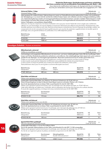 Technische %u00c4nderungen. Preis%u00e4nderungen und Irrtum vorbehalten.Alle Preise verstehen sich als unverbindliche Preisempfehlung exkl. MwSt + vRGSous r%u00e9serve de modifications techniques, de changements de prix et d%u2019erreurs. Tous les prix s%u2018entendent comme prix recommand%u00e9s sans engagement, HT + TAR404Zubeh%u00f6r Metalloberfl%u00e4chen-BearbeitungAccessoires Traitement de surface m%u00e9talliquePoliercreme Poli cremeCr%u00e8me de polissage Poli cremeRabattcodeCode de remise2Creme f%u00fcr die Endpolitur, Dose 1 kg.Cr%u00e8me de polissage de finition, bo%u00eete de 1 kg.BezeichnungD%u00e9signationGewichtPoidsBestell-Nr.R%u00e9f%u00e9renceVEUEPreis PrixPC Inox ES1 kg255.006128.%u2013Poli-Set mini white/blue/cremePoli Set mini (white/blue/creme)RabattcodeCode de remise2Polierset bestehend aus: Polierpaste weiss, Polierpaste blau je ca. 100 Gramm und Poliercreme ca. 100 Gramm.Kit de polissage comprenant : p%u00e2te de polissage blanche, p%u00e2te de polissage bleue, env. 100 grammes de chaque, et cr%u00e8me de polissage, env. 100 grammes.BezeichnungD%u00e9signationBestell-Nr.R%u00e9f%u00e9renceVEUEPreis PrixPoli Set min (white/blue/creme) PP-W/B/C365.041120.%u2013Schleifband ZIRCOFLEXBande abrasive ZIRCOFLEXRabattcodeCode de remise9Schleifband mit hochwertigem, selbstsch%u00e4rfendem Zirkonkorund f%u00fcr verl%u00e4ngerte Standzeit. Hohe Abtragsleistung beim Grob- und Zwischenschliff von Stahl- und Edelstahloberfl%u00e4chen.Bande abrasive avec corindon de zirconium de haute qualit%u00e9 %u00e0 auto-aff%u00fbtage pour une plus longue dur%u00e9e de vie. Capacit%u00e9 abrasive %u00e9lev%u00e9e lors du pon%u00e7age grossier et interm%u00e9diaire des surfaces en acier et acier inoxydable.BezeichnungD%u00e9signationBandl%u00e4ngeLongueur de bandeBandbreiteLargeur de bandeKornGrainBestell-Nr.R%u00e9f%u00e9renceVEUEPreis Prix533x4 ZI-P60 VE10533 mm4 mmP 60303.6151022.%u2013533x4 ZI-P80 VE10533 mm4 mmP 80434.6201022.%u2013533x4 ZI-P120 VE10533 mm4 mmP 120303.6231022.%u2013533x9 ZI-P40 VE10533 mm9 mmP 40257.1011026.%u2013533x9 ZI-P60 VE10533 mm9 mmP 60257.1051024.%u2013533x9 ZI-P80 VE10533 mm9 mmP 80434.6391024.%u2013533x9 ZI-P120 VE10533 mm9 mmP 120257.1021024.%u2013533x30 ZI-P40 VE10533 mm30 mmP 40256.5381031.%u2013533x30 ZI-P60 VE10533 mm30 mmP 60255.3281031.%u2013533x30 ZI-P80 VE10533 mm30 mmP 80434.6471028.%u2013533x30 ZI-P120 VE10533 mm30 mmP 120255.3291030.%u2013Schleifband CORUFLEXBande abrasive CORUFLEXRabattcodeCode de remise9Hochflexibles Schleifband mit verg%u00fctetem Korundkorn und schleifaktiven Wirkstoffen f%u00fcr die Edelstahlbearbeitung. Besonders geeignet f%u00fcr den Feinschliff.Bande abrasive ultra souple avec grain corindon tremp%u00e9 et agents abrasifs actifs pour le traitement de l%u2019acier inoxydable. Particuli%u00e8rement adapt%u00e9 au pon%u00e7age de finition.BezeichnungD%u00e9signationBandl%u00e4ngeLongueur de bandeBandbreiteLargeur de bandeKornGrainBestell-Nr.R%u00e9f%u00e9renceVEUEPreis Prix533x4 CR-P120 VE10533 mm4 mmP 120434.7601022.%u2013533x4 CR-P180 VE10533 mm4 mmP 180434.7791022.%u2013533x4 CR-P240 VE10533 mm4 mmP 240434.7871022.%u2013533x9 CR-P120 VE10533 mm9 mmP 120434.7951026.%u2013533x9 CR-P180 VE10533 mm9 mmP 180434.8091026.%u2013533x9 CR-P240 VE10533 mm9 mmP 240434.8171026.%u2013533x30 CR-P120 VE10533 mm30 mmP 120434.8251031.%u2013533x30 CR-P180 VE10533 mm30 mmP 180434.8331031.%u2013533x30 CR-P240 VE10533 mm30 mmP 240434.8411031.%u2013
