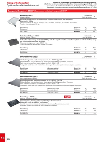 Technische %u00c4nderungen. Preis%u00e4nderungen und Irrtum vorbehalten.Alle Preise verstehen sich als unverbindliche Preisempfehlung exkl. MwSt + vRGSous r%u00e9serve de modifications techniques, de changements de prix et d%u2019erreurs. Tous les prix s%u2018entendent comme prix recommand%u00e9s sans engagement, HT + TAR546Akku-MaschinenMachines %u00e0 batterieTechnische DatenAkku-Spannung12VAkku-Kapazit%u00e4t2.5 / 5.0 AhLeerlaufhubzahl800 %u2013 3%u2018000 1/minHub23 mmPedelhubstufen4 StufenDrehzahlstufen1-5 +A StufenSchwenkbereich0-45%u00b0Max. Materialst%u00e4rke Holz90 mmMax. Materialst%u00e4rke Metall10 mmAbmessung LxBxH220 x 69 x 183 mmGewicht ohne Akkupack1.46 kgCaract%u00e9ristiques techniquesTension de batterie12VCapacit%u00e9 de batterie2.5 / 5.0 AhVitesse de cycle %u00e0 vide800 %u2013 3%u2018000 tr/minCourse23 mmNiveaux de mouvement pendulaire4 niveauxNiveaux de vitesse1-5 +A nixeauxPlage de pivotement0-45%u00b0%u00c9paisseur de mat%u00e9riau max. bois90 mm%u00c9paisseur de mat%u00e9riau max. m%u00e9tal10 mmDimension LxlxH220x69x183mmPoids sans batterie1.46 kgJSP 12-ECBestell-Nr.R%u00e9f%u00e9renceGTINRabattcodeCode de remisePreisPrixAkku-Stichs%u00e4ge 12V Scie sauteuse %u00e0 batterie 12V531.31740302932515711240.%u2013 exkl. MwSt. hors TVA 0.56 vRGTARNEWLieferumfang1x Spanflugschutz geschlossen1x Spannreissschutz490.2291x Saugadapter %u00d8 271x Innensechskantschl%u00fcssel, SW 31x Gleitschuh1x Koffereinlage533.1661x Transportkoffer L-BOXX%u00ae414.085Equipement de base1x protection contre la projection de copeaux ferm%u00e9e1x protection contre les %u00e9clats490.2291x adaptateur d%u2018aspiraton %u00d8 271x cl%u00e9 allen, SW 31x patin coulissant1x insert pour coffret533.1661x coffret de transport L-BOXX%u00ae414.085Technische DatenAkku-Spannung12VAkku-Kapazit%u00e4t2.5 / 5.0 AhLeerlaufhubzahl0 %u2013 3%u2018000 1/minHub16 mmMax. Materialst%u00e4rke Holz90 mmMax. Materialst%u00e4rke Metall60 mmAbmessung LxBxH330 x 75 x 138 mmGewicht ohne Akkupack1.5 kgCaract%u00e9ristiques techniquesTension de batterie12VCapacit%u00e9 de batterie2.5 / 5.0 AhVitesse de cycle %u00e0 vide0 %u2013 3%u2018000 tr/minCourse16 mm%u00c9paisseur de mat%u00e9riau max. bois90 mm%u00c9paisseur de mat%u00e9riau max. m%u00e9tal60 mmDimension LxlxH330x75x138mmPoids sans batterie1.5 kgRS 16 12-EC CBestell-Nr.R%u00e9f%u00e9renceGTINRabattcodeCode de remisePreisPrixLeistungsstarke Akku-S%u00e4bels%u00e4ge 12V Puissante scie sabre %u00e0 batterie 12V531.31440302932515401190.%u2013 exkl. MwSt. hors TVA 0.56 vRGTARNEWTechnische DatenAkku-Spannung12VAkku-Kapazit%u00e4t2.5 / 5.0 AhLeerlaufhubzahl0 %u2013 3%u2018000 1/minHub16 mmMax. Materialst%u00e4rke Holz90 mmMax. Materialst%u00e4rke Metall60 mmAbmessung LxBxH330 x 75 x 138 mmGewicht ohne Akkupack1.5 kgCaract%u00e9ristiques techniquesTension de batterie12VCapacit%u00e9 de batterie2.5 / 5.0 AhVitesse de cycle %u00e0 vide0 %u2013 3%u2018000 tr/minCourse16 mm%u00c9paisseur de mat%u00e9riau max. bois90 mm%u00c9paisseur de mat%u00e9riau max. m%u00e9tal60 mmDimension LxlxH330x75x138mmPoids sans batterie1.5 kgRS 16 12-ECBestell-Nr.R%u00e9f%u00e9renceGTINRabattcodeCode de remisePreisPrixLeistungsstarke Akku-S%u00e4bels%u00e4ge 12V Puissante scie sabre %u00e0 batterie 12V531.31540302932515571240.%u2013 exkl. MwSt. hors TVA 0.56 vRGTARNEWLieferumfang1x Koffereinlage533.1681x Transportkoffer L-BOXX%u00ae414.085Equipement de base1x insert pour coffret533.1681x coffret de transport L-BOXX%u00ae414.085Das passende Zubeh%u00f6r finden Sie ab der Seite 46.Vous trouverez les accessoires correspondants %u00e0 partir de la page 46.Das passende Zubeh%u00f6r finden Sie ab der Seite 46.Vous trouverez les accessoires correspondants %u00e0 partir de la page 46.
