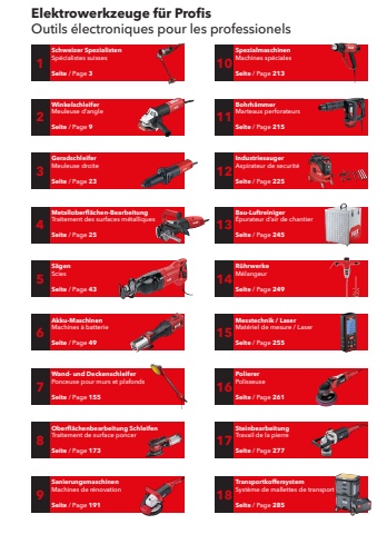 Elektrowerkzeuge f%u00fcr ProfisOutils %u00e9lectroniques pour les professionels1Schweizer SpezialistenSp%u00e9cialistes suissesSeite / Page 310SpezialmaschinenMachines sp%u00e9cialesSeite / Page 2132WinkelschleiferMeuleuse d%u2018angleSeite / Page 93GeradschleiferMeuleuse droiteSeite / Page 234Metalloberfl%u00e4chen-BearbeitungTraitement des surfaces m%u00e9talliquesSeite / Page 255S%u00e4genSciesSeite / Page 436Akku-MaschinenMachines %u00e0 batterieSeite / Page 497Wand- und DeckenschleiferPonceuse pour murs et plafondsSeite / Page 1558Oberfl%u00e4chenbearbeitung SchleifenTraitement de surface poncerSeite / Page 1739SanierungsmaschinenMachines de r%u00e9novationSeite / Page 19111Bohrh%u00e4mmerMarteaux perforateursSeite / Page 21512IndustriesaugerAspirateur de securit%u00e9Seite / Page 22513Bau-Luftreiniger%u00c9purateur d%u2018air de chantierSeite / Page 24514R%u00fchrwerkeM%u00e9langeurSeite / Page 24915Messtechnik / LaserMat%u00e9riel de mesure / LaserSeite / Page 25516PoliererPolisseuseSeite / Page 26117SteinbearbeitungTravail de la pierreSeite / Page 27718TransportkoffersystemSyst%u00e8me de mallettes de transportSeite / Page 285
