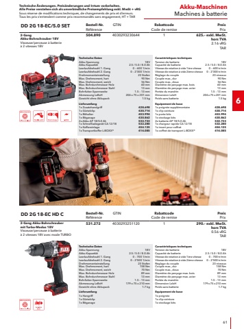 Technische %u00c4nderungen. Preis%u00e4nderungen und Irrtum vorbehalten.Alle Preise verstehen sich als unverbindliche Preisempfehlung exkl. MwSt + vRGSous r%u00e9serve de modifications techniques, de changements de prix et d%u2019erreurs. Tous les prix s%u2018entendent comme prix recommand%u00e9s sans engagement, HT + TAR132WinkelschleiferMeuleses d%u2018angleTechnische DatenLeistungsaufnahme1700 WLeistungsabgabe1050 WSpannung230 VFrequenz50/60 HzMax. Scheibendurchmesser125 mmLeerlaufdrehzahl11%u2018500 1/minWerkzeugaufnahmeM14Kabell%u00e4nge4.0 mAbmessung LxBxH340 x 77 x 105 mmGewicht2.6 kgLieferumfang1x Schutzhaube Schleifen436.8601x SoftVib-Handgriff530.9031x Spannflansch335.2821x Spannmutter M14100.080Caract%u00e9ristiques techniquesPuissance absorb%u00e9e1700 WPuissance utile1050 WTension230 VFr%u00e9quence50/60 HzDiam%u00e8tre de disque max.125 mmVitesse de rotation %u00e0 vide11%u2018500 tr/minEmmanchementM14Longueur de c%u00e2ble4.0 mDimension LxlxH340 x 77 x 105 mmPoids2.6 kgEquipement de base1x carter de protection du pon%u00e7age436.8601x poign%u00e9e SoftVib530.9031x bride de serrage335.2821x ecrou de serrage M14100.080LB 17-11 125Bestell-Nr.R%u00e9f%u00e9renceGTINRabattcodeCode de remisePreisPrix1700 Watt Winkelschleifer mitBremse, 125 mmMeuleuse d%u2018angle 1700 Watt avecfrein, 125 mm447.62540302931972681285.%u2013 exkl. MwSt. hors TVA 0.56 vRGTARTechnische DatenLeistungsaufnahme1700 WLeistungsabgabe1050 WSpannung230 VFrequenz50/60 HzMax. Scheibendurchmesser125 mmLeerlaufdrehzahl2%u2018800 %u201311%u2018500 1/minWerkzeugaufnahmeM14Kabell%u00e4nge4.0 mAbmessung LxBxH340 x 77 x 105 mmGewicht2.6 kgLieferumfang1x Schutzhaube Schleifen436.8601x SoftVib-Handgriff530.9031x Spannflansch335.2821x Spannmutter M14100.080Caract%u00e9ristiques techniquesPuissance absorb%u00e9e1700 WPuissance utile1050 WTension230 VFr%u00e9quence50/60 HzDiam%u00e8tre de disque max.125 mmVitesse de rotation %u00e0 vide2%u2018800 %u2013 11%u2018500 tr/minEmmanchementM14Longueur de c%u00e2ble4.0 mDimension LxlxH340 x 77 x 105 mmPoids2.6 kgEquipement de base1x carter de protection du pon%u00e7age436.8601x poign%u00e9e SoftVib530.9031x bride de serrage335.2821x ecrou de serrage M14100.080LBE 17-11 125Bestell-Nr.R%u00e9f%u00e9renceGTINRabattcodeCode de remisePreisPrix1700 Watt Winkelschleifer mit variablerDrehzahl und Bremse, 125 mmMeuleuse d%u2018angle 1700 Watt %u00e0 vitessede rotation variable et frein, 125 mm447.66840302931972821310.%u2013 exkl. MwSt. hors TVA 0.56 vRGTAR