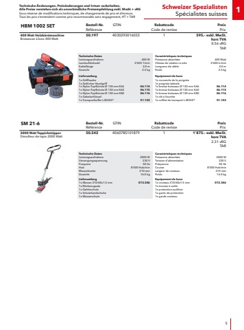 Technische %u00c4nderungen. Preis%u00e4nderungen und Irrtum vorbehalten.Alle Preise verstehen sich als unverbindliche Preisempfehlung exkl. MwSt + vRGSous r%u00e9serve de modifications techniques, de changements de prix et d%u2019erreurs. Tous les prix s%u2018entendent comme prix recommand%u00e9s sans engagement, HT + TAR51Schweizer SpezialistenSp%u00e9cialistes suissesTechnische DatenLeistungsaufnahme400 WLeerlaufdrehzahl2%u2018600 1/minKabell%u00e4nge4.0 mGewicht2.3 kgLieferumfang1x Griffhaube1x Seitlicher Handgriff1x Nylon-Topfb%u00fcrste %u00d8 130 mm K4606.1141x Nylon-Topfb%u00fcrste %u00d8 130 mm K6006.1151x Nylon-Topfb%u00fcrste %u00d8 130 mm K8006.1161x Gabelschl%u00fcssel1x Transportkoffer L-BOXX%u00ae51.143Caract%u00e9ristiques techniquesPuissance absorb%u00e9e400 WattVitesse de rotation %u00e0 vide2%u2018600 tr/minLongueur de c%u00e2ble4.0 mPoids2.3 kgEquipement de base1x couvercle de la poign%u00e9e1x poign%u00e9e lat%u00e9rale1x brosse boisseau %u00d8 130 mm K4606.1141x brosse boisseau %u00d8 130 mm K6006.1151x brosse boisseau %u00d8 130 mm K8006.1161x cl%u00e9 %u00e0 fourche1x coffret de transport L-BOXX%u00ae51.143HBM 1002 SETBestell-Nr.R%u00e9f%u00e9renceGTINRabattcodeCode de remisePreisPrix400 Watt Holzb%u00fcrstmaschineBrosseuse %u00e0 bois 400 Watt50.19740302930160331595.%u2013 exkl. MwSt. hors TVA 0.56 vRGTARTechnische DatenLeistungsaufnahme2000 WVersorgungsspannung230 VFrequenz50 HzHub8%u2018500 Hub/minMesserbreite210 mmGewicht16.0 kgLieferumfang1x Messer 210/60x1.5 mm013.3461x Werkzeugsatz1x Geh%u00f6rschutz1x Schutzhandschuhe1x MesserschutzCaract%u00e9ristiques techniquesPuissance absorb%u00e9e2000 WTension d%u2018alimentation230 VFr%u00e9quence50 HzCourse8%u2018500 Hub/minLargeur de couteau210 mmPoids16.0 kgEquipement de base1x couteau 210/60x1.5 mm013.3461x trousse %u00e0 outils1x protection auditive1x gants de protection1x garde couteauSM 21-6Bestell-Nr.R%u00e9f%u00e9renceGTINRabattcodeCode de remisePreisPrix2000 Watt TeppichstripperD%u00e9colleur de tapis 2000 Watt50.542406078510187911%u2018875.%u2013 exkl. MwSt. hors TVA 2.31 vRGTAR