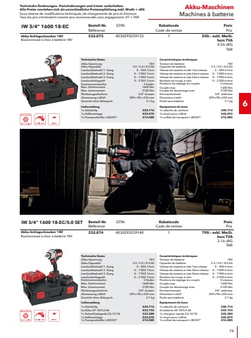 Technische %u00c4nderungen. Preis%u00e4nderungen und Irrtum vorbehalten.Alle Preise verstehen sich als unverbindliche Preisempfehlung exkl. MwSt + vRGSous r%u00e9serve de modifications techniques, de changements de prix et d%u2019erreurs. Tous les prix s%u2018entendent comme prix recommand%u00e9s sans engagement, HT + TAR314Metalloberfl%u00e4chen-BearbeitungTraitement de surface m%u00e9talliqueTechnische DatenLeistungsaufnahme1400 WLeistungsabgabe880 WSpannung230 VFrequenz50/60 HzLeerlaufdrehzahl1%u2018000 %u2013 3%u2018500 1/minB%u00fcrsten-/Walzendurchmesser Max.120 mmB%u00fcrsten-/Walzenbreite Max.100 mmWerkzeugaufnahme19 mmKabell%u00e4nge4.0 mAbmessung LxBxH335 x 190 x 210 mmGewicht2.9 kgLieferumfang1x Schleifvorsatz B%u00fcrsten461.5551x Koffereinlage451.9911x Transportkoffer L-BOXX%u00ae414.093Caract%u00e9ristiques techniquesPuissance absorb%u00e9e1400 WPuissance utile880 WTension230 VFr%u00e9quence50/60 HzVitesse de rotation %u00e0 vide1%u2018000 %u2013 3%u2018500 tr/minDiam%u00e8tre de brosse120 mmLargeur de brosse100 mmEmmanchement19 mmLongueur de c%u00e2ble4.0 mDimension LxlxH335 x 190 x 210 mmPoids2.9 kgEquipement de base1x adaptateur de pon%u00e7age brossage461.5551x insert pour coffret451.9911x coffret de transport L-BOXX%u00ae414.093BBE 14-3 110Bestell-Nr.R%u00e9f%u00e9renceGTINRabattcodeCode de remisePreisPrixB%u00fcrstmaschine TRINOXFLEXBrosseuse TRINOXFLEX471.09740302932105161800.%u2013 exkl. MwSt. hors TVA 0.56 vRGTARTechnische DatenLeistungsaufnahme1400 WLeistungsabgabe880 WSpannung230 VFrequenz50/60 HzLeerlaufdrehzahl1%u2018000 %u2013 3%u2018500 1/minB%u00fcrsten-/Walzendurchmesser Max.120 mmB%u00fcrsten-/Walzenbreite Max.100 mmWerkzeugaufnahme19 mmKabell%u00e4nge4.0 mAbmessung LxBxH335 x 190 x 210 mmGewicht2.9 kgLieferumfang1x Schleifvorsatz B%u00fcrsten461.5551x Nylonb%u00fcrste465.1351x Litzendrahtb%u00fcrste Stahl465.1781x Koffereinlage451.9911x Transportkoffer L-BOXX%u00ae414.093Caract%u00e9ristiques techniquesPuissance absorb%u00e9e1400 WPuissance utile880 WTension230 VFr%u00e9quence50/60 HzVitesse de rotation %u00e0 vide1%u2018000 %u2013 3%u2018500 tr/minDiam%u00e8tre de brosse120 mmLargeur de brosse100 mmEmmanchement19 mmLongueur de c%u00e2ble4.0 mDimension LxlxH335 x 190 x 210 mmPoids2.9 kgEquipement de base1x adaptateur de pon%u00e7age brossage461.5551x brosse nylon465.1351x brosse acier %u00e0 fils torsad%u00e9s465.1781x insert pour coffret451.9911x coffret de transport L-BOXX%u00ae414.093BBE 14-3 110 SetBestell-Nr.R%u00e9f%u00e9renceGTINRabattcodeCode de remisePreisPrixB%u00fcrstmaschine TRINOXFLEXBrosseuse TRINOXFLEX461.504403029320562811%u2018000.%u2013 exkl. MwSt. hors TVA 0.56 vRGTAR