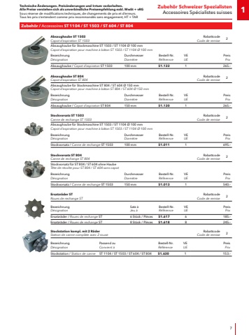 Technische %u00c4nderungen. Preis%u00e4nderungen und Irrtum vorbehalten.Alle Preise verstehen sich als unverbindliche Preisempfehlung exkl. MwSt + vRGSous r%u00e9serve de modifications techniques, de changements de prix et d%u2019erreurs. Tous les prix s%u2018entendent comme prix recommand%u00e9s sans engagement, HT + TAR7Zubeh%u00f6r / Accessoires ST 1104 / ST 1503 / ST 604 / ST 8041Zubeh%u00f6r Schweizer SpezialistenAccessoires Sp%u00e9cialistes suissesAbsaughaube ST 1503Capot d%u2018aspiration ST 1503RabattcodeCode de remise2Absaughaube f%u00fcr Stockmaschine ST 1503 / ST 1104 %u00d8 100 mmCapot d%u2018aspiration pour machine %u00e0 b%u00e2ton ST 1503 / ST 1104 %u00d8 100 mmBezeichnungD%u00e9signationDurchmesserDiam%u00e8treBestell-Nr.R%u00e9f%u00e9renceVEUEPreis PrixAbsaughaube / Capot d%u2018aspiraton ST 1503100 mm51.1221265.%u2013Absaughaube ST 804Capot d%u2018aspiration ST 804RabattcodeCode de remise2Absaughaube f%u00fcr Stockmaschine ST 804 / ST 604 %u00d8 150 mmCapot d%u2018aspiration pour machine %u00e0 b%u00e2ton ST 804 / ST 604 %u00d8 150 mmBezeichnungD%u00e9signationDurchmesserDiam%u00e8treBestell-Nr.R%u00e9f%u00e9renceVEUEPreis PrixAbsaughaube / Capot d%u2018aspiraton ST 804150 mm51.1201265.%u2013Stockvorsatz ST 1503Canne de rechange ST 1503RabattcodeCode de remise2Absaughaube f%u00fcr Stockmaschine ST 1503 / ST 1104 %u00d8 100 mmCapot d%u2018aspiration pour machine %u00e0 b%u00e2ton ST 1503 / ST 1104 %u00d8 100 mmBezeichnungD%u00e9signationDurchmesserDiam%u00e8treBestell-Nr.R%u00e9f%u00e9renceVEUEPreis PrixStockvorsatz / Canne de rechange ST 1503100 mm51.0111695.%u2013Stockvorsatz ST 804Canne de rechange ST 804RabattcodeCode de remise2Stockvorsatz f%u00fcr ST 804 / ST 604 ohne HaubeT%u00eate de r%u00e9colte pour ST 804 / ST 604 sans capotBezeichnungD%u00e9signationDurchmesserDiam%u00e8treBestell-Nr.R%u00e9f%u00e9renceVEUEPreis PrixStockvorsatz / Canne de rechange ST 1503150 mm51.0131540.%u2013Ersatzr%u00e4der STRoues de rechange STRabattcodeCode de remise2BezeichnungD%u00e9signationSatz %u00e0Jeu %u00e0Bestell-Nr.R%u00e9f%u00e9renceVEUEPreis PrixErsatzr%u00e4der / Roues de rechange ST6 St%u00fcck / Pi%u00e8ces51.6176185.%u2013Ersatzr%u00e4der / Roues de rechange ST8 St%u00fcck / Pi%u00e8ces51.6188245.%u2013Stockstation kompl. mit 2 R%u00e4derStation de canne compl%u00e0te avec 2 rouseRabattcodeCode de remise2BezeichnungD%u00e9signationPassend zuConvient %u00e0Bestell-Nr.R%u00e9f%u00e9renceVEUEPreis PrixStockstation / Station de canneST 1104 / ST 1503 / ST 604 / ST 80451.6301153.%u2013