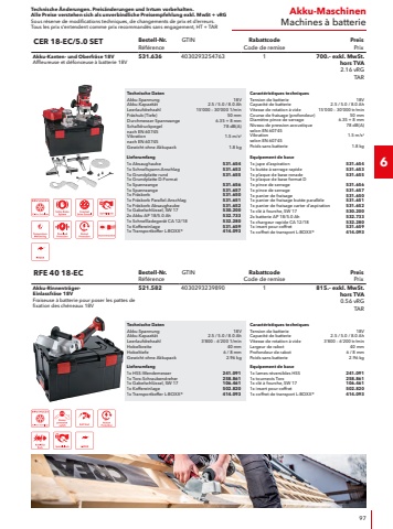 Elektrowerkzeuge f%u00fcr ProfisOutils %u00e9lectroniques pour les professionels1Schweizer SpezialistenSp%u00e9cialistes suissesSeite / Page 310SpezialmaschinenMachines sp%u00e9cialesSeite / Page 2132WinkelschleiferMeuleuse d%u2018angleSeite / Page 93GeradschleiferMeuleuse droiteSeite / Page 234Metalloberfl%u00e4chen-BearbeitungTraitement des surfaces m%u00e9talliquesSeite / Page 255S%u00e4genSciesSeite / Page 436Akku-MaschinenMachines %u00e0 batterieSeite / Page 497Wand- und DeckenschleiferPonceuse pour murs et plafondsSeite / Page 1558Oberfl%u00e4chenbearbeitung SchleifenTraitement de surface poncerSeite / Page 1739SanierungsmaschinenMachines de r%u00e9novationSeite / Page 19111Bohrh%u00e4mmerMarteaux perforateursSeite / Page 21512IndustriesaugerAspirateur de securit%u00e9Seite / Page 22513Bau-Luftreiniger%u00c9purateur d%u2018air de chantierSeite / Page 24514R%u00fchrwerkeM%u00e9langeurSeite / Page 24915Messtechnik / LaserMat%u00e9riel de mesure / LaserSeite / Page 25516PoliererPolisseuseSeite / Page 26117SteinbearbeitungTravail de la pierreSeite / Page 27718TransportkoffersystemSyst%u00e8me de mallettes de transportSeite / Page 285