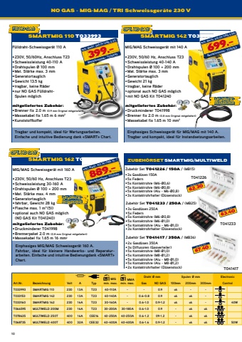 NO GAS - MIG-MAG / TRI Schweissger%u00e4te 230 V10F%u00fclldraht-Schweissger%u00e4t 110 A%u2022230V, 50/60Hz, Anschluss T23%u2022Schweissleistung 40-110 A%u2022Drahtspulen %u00d8 100 mm%u2022Mat. St%u00e4rke max. 3 mm%u2022Generatortauglich%u2022Gewicht 13.5 kg%u2022tragbar, keine R%u00e4der%u2022nur NO GAS F%u00fclldrahtSpulen m%u00f6glichmitgeliefertes Zubeh%u00f6r:%u2022Brenner fix 2.0 m (0.9 mm Original mitgeliefert)%u2022Massekabel fix 1.65 m 6 mm2%u2022KunststoffkofferDraht %u00d8 mm Spulen %u00d8 mm Electronic Art.Nr. Bezeichnung Volt A Typ min. max. min. max. Gas NO GAS 100mm 200mm 300mm Control T033993 SMARTMIG 110 230 13A T23 40-110A - - 0.9 ok - - T033153 SMARTMIG 142 230 13A T23 40-140A - 0.6-0.8 0.9 ok ok - T033160 SMARTMIG 162 230 16A T23 30-160A - 0.6-1.0 0.9-1.2 ok ok - 40W T066595 MULTIWELD 200M 230 16A T23 30-200A 30-180A 0.6-1.0 0.9 - ok ok T078635 MULTIWELD 250T 400 16A CEE16 40-250A 40-250A 0.6-1.2 09-1.2 - ok ok T068735 MULTIWELD 400T 400 32A CEE32 40-400A 40-400A 0.6-1.6 0.9-1.2 - ok ok 50W MIG MMASMARTMIG 110 T033993MIG/MAG Schweissger%u00e4t mit 140 A%u2022230V, 50/60 Hz, Anschluss T23%u2022Schweissleistung 40-140 A%u2022Drahtspulen %u00d8 100 + 200 mm%u2022Mat. St%u00e4rke max. 3 mm%u2022Generatortauglich%u2022Gewicht 21 kg%u2022tragbar, keine R%u00e4der%u2022optional auch NO GAS m%u00f6glich%u2022mit NO GAS Kit T041240mitgeliefertes Zubeh%u00f6r:%u2022Druckminderer T041998%u2022Brenner fix 2.0 m (0.8 mm Original mitgeliefert)%u2022Massekabel fix 1.65 m 10 mm2MIG/MAG Schweissger%u00e4t mit 160 A%u2022230V, 50/60 Hz, Anschluss T23%u2022Schweissleistung 30-160 A%u2022Drahtspulen %u00d8 100 + 200 mm%u2022Mat. St%u00e4rke max. 4 mm%u2022Generatortauglich%u2022fahrbar, Gewicht 28 kg%u2022Flasche max. 1 m3 (5l)%u2022optional auch NO GAS m%u00f6glich(NO GAS Kit T041240)mitgeliefertes Zubeh%u00f6r:%u2022Druckminderer T041998%u2022Brennerpaket 2.0 m (0.8 mm Original mitgeliefert)%u2022Massekabel fix 1.65 m 16 mm2%u2022%u2022%u2022%u2022%u2022%u2022%u2022%u2022mitgeliefertes Zubeh%u00f6r:%u2022%u2022%u2022(0.9 mm Original mitgeliefert)399.%u2013exkl. MwSt. 366.79 (VRG 2.31)Bestellnummer: T033993Tragbar und kompakt, ideal f%u00fcr Wartungsarbeiten.Einfache und intuitive Bedienung dank %u00abSMART%u00bb Chart.Einphasiges Schweissger%u00e4t f%u00fcr MIG/MAG mit 140 A.Tragbar und kompakt, ideal f%u00fcr Instandsetzungsarbeiten.Einphasiges MIG/MAG Schweissger%u00e4t 160 A.Fahrbar, ideal f%u00fcr kleinere Handwerks- und Reparaturarbeiten. Einfache und intuitive Bedienungdank %u00abSMART%u00bb Chart.MIT DRUCKREDUZIERERZubeh%u00f6r Set T041226 / 150A / (MB15)%u2022 3x Gasd%u00fcsen 150A%u2022 5x Federn%u2022 5x Kontaktrohre (M6-%u00d80,6)%u2022 5x Kontaktrohre (M6-%u00d80,8)%u2022 5x Kontaktrohre (Alu - M6-%u00d80,8)%u2022 3x Kontaktrohrhalter (D%u00fcsenstock)T041226T041233T041417Zubeh%u00f6r Set T041233 / 250A / (MB25)%u2022 3x Gasd%u00fcsen 250A%u2022 5x Federn%u2022 5x Kontaktrohre (M6-%u00d80,8)%u2022 5x Kontaktrohre (M6-%u00d81,0)%u2022 5x Kontaktrohre (Alu - M6-%u00d81,0)%u2022 3x Kontaktrohrhalter (D%u00fcsenstock)Zubeh%u00f6r Set T041417 / 350A / (MB36)%u2022 2x Gasd%u00fcsen 350A%u2022 3x Diffusoren (Gasverteiler)%u2022 5x Kontaktrohre (M8-%u00d81,0)%u2022 5x Kontaktrohre (M8-%u00d81,2)%u2022 5x Kontaktrohre (Alu - M8-%u00d81,0)%u2022 5x Kontaktrohre (Alu - M8-%u00d81,2)%u2022 2x Kontaktrohrhalter (D%u00fcsenstock)62.30exkl. MwSt. 57.6363.40exkl. MwSt. 58.6567.40exkl. MwSt. 62.35optional auch NO GAS m%u00f6glich%u2022%u2022%u2022%u2022%u2022230V, 50/60 Hz, Anschluss T23Zubeh%u00f6r Set %u2022%u2022%u2022%u2022%u2022MIT DRUCKREDUZIERERSMARTMIG 142 T033153699.%u2013exkl. MwSt. 641.06 (VRG 5.56)Bestellnummer: T033153SMARTMIG 162 T033160FIX NO GAS OPT. NO GASOPT. NO GAST033160 ZUBEH%u00d6RSET SMARTMIG/MULTIWELD889.%u2013exkl. MwSt. 812.39 (VRG 10.-)Bestellnummer: T033160
