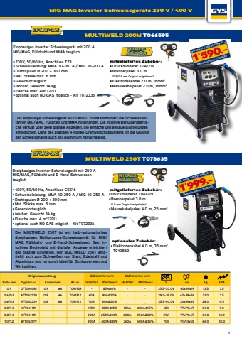 Originalausstattung MIG EN60974-1 (40%u00b0C) MMA EN60974-1 (40%u00b0C)Rolle mm Typ/Art.nr. Kontaktrohr Art.nr. IA(60%) X%(l2max) IA(60%) X%(l2max) V cm kg KVA0.9 D/T044081 0.9 M6 T041929 - 85A@6% - - 25.5-30.0V 40x39x19 13.5 3.50.6/0.8 A/T042339 0.8 M6 T041912 60A 90A@20% - - 28.0-39.0V 42x38x24 21.0 3.50.6/0.8 A/T042339 0.8 M6 T041912 70A 60A@20% - - 25.5-40.0V 33x54x45 28.0 4.50.8/1.0 A/T041189 115A 200A@15% 104A 200A@15% 65V 77x79x47 34.0 9.00.8/1.0 A/T041189 200A 250A@30% 200A 250A@30% 59V 77x79x47 34.0 10.01.0/1.2 B/T042179 300A 400A@35% 240A 400A@35% 70V 91x93x55 64.0 20.0MIG MAG Inverter Schweissger%u00e4te 230 V / 400 V 1111Einphasiges Inverter Schweissger%u00e4t mit 200 AMIG/MAG, F%u00fclldraht und MMA tauglich%u2022230V, 50/60 Hz, Anschluss T23%u2022Schweissleistung: MMA 30-180 A / MIG 30-200 A%u2022Drahtspulen %u00d8 200 + 300 mm%u2022Mat. St%u00e4rke max. 6 mm%u2022Generatortauglich%u2022fahrbar, Gewicht 34 kg%u2022Flasche max. 4m3 (20l)%u2022optional auch NO GAS m%u00f6glich - Kit T072336Das einphasige Schweissger%u00e4t MULTIWELD 200M kombiniert die Schweissverfahren MIG/MAG, F%u00fclldraht und MMA miteinander. Die intuitive Benutzeroberfl%u00e4che verf%u00fcgt %u00fcber zwei digitale Anzeigen, die einfache und genaue Einstellungen erm%u00f6glichen. Dank des pr%u00e4zisen 4-Rollen-Drahtvorschubsystems ist die Qualit%u00e4t der Schweissn%u00e4hte auch bei Aluminium hervorragend.Dreiphasiges Inverter Schweissger%u00e4t mit 250 AMIG/MAG, F%u00fclldraht und E-Hand-Schweissentauglich%u2022400V, 50/60 Hz, Anschluss CEE16%u2022Schweissleistung: MMA 40-250 A / MIG 40-250 A%u2022Drahtspulen %u00d8 200 + 300 mm%u2022Mat. St%u00e4rke max. 8 mm%u2022Generatortauglich%u2022fahrbar, Gewicht 34 kg%u2022Flasche max. 4 m3 (20l)%u2022optional auch NO GAS m%u00f6glich - Kit T072336Der MULTIWELD 250T ist ein halb-automatisches dreiphasiges Multiprozess-Schweissger%u00e4t f%u00fcr MIG/MAG, F%u00fclldraht- und E-Hand-Schweissen. Sein intuitives Bedienfeld mit digitaler Anzeige erleichtert das pr%u00e4zise Einstellen. Der MULTIWELD 250T empfiehlt sich zum Schwei%u00dfen von Stahl, Edelstahl und Aluminium und ist somit ideal f%u00fcr Schlossereien und Werkst%u00e4tten.MIT DRUCKREDUZIERERmitgeliefertes Zubeh%u00f6r:%u2022Druckminderer T041219%u2022Brennerpaket 3.0 m(1.0 mm Original mitgeliefert)%u2022Massekabelpaket 4.0 m, 25 mm2MITDRUCKREDUZIERERmitgeliefertes Zubeh%u00f6r:%u2022Druckminderer T041219%u2022Brennerpaket 3.0 m(0.8/0.9 mm Original mitgeliefert)%u2022Elektrodenkabel 2.0 m, 16mm2%u2022Massekabelpaket 2.0 m, 16mm2optionales Zubeh%u00f6r:%u2022Elektrodenkabel 4.0 m, 35 mm2T04386221%u2018999.%u2013exkl. MwSt. 1%u2018839.21 (VRG 10.-)Bestellnummer: T078635MULTIWELD 200M T066595MULTIWELD 250T T0786351%u2018590.%u2013exkl. MwSt. 1%u2018460.86 (VRG 10.-)Bestellnummer: T066595OPT. NO GASOPT. NO GASmitgeliefertes Zubeh%u00f6r:
