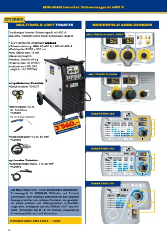 MIG-MAG Inverter Schweissger%u00e4t 400 V12Dreiphasiges Inverter Schweissger%u00e4t mit 400 AMIG/MAG, F%u00fclldraht und E-Hand-Schweissen tauglich%u2022400V, 50/60 Hz, Anschluss CEE32%u2022Schweissleistung: MMA 40-400 A / MIG 40-400 A%u2022Drahtspulen %u00d8 200 + 300 mm%u2022Mat. St%u00e4rke max. 15 mm%u2022Generatortauglich%u2022fahrbar, Gewicht 64 kg%u2022Flasche max. 10 m3 (50l)%u2022optional auch NO GASm%u00f6glich - Kit T072343mitgeliefertes Zubeh%u00f6r:%u2022Druckminderer T041219%u2022Brennerpaket 4.0 mf%u00fcr Stahl/InoxT045392(1.2 mm Original mitgeliefert)%u2022Massekabelpaket 4.0 m, 50 mm2T047853optionales Zubeh%u00f6r:%u2022Elektrodenkabel 500A, 4 m, 50 mm2T043879Das MULTIWELD 400T ist ein dreiphasiges MultiprozessSchweissger%u00e4t f%u00fcr MIG/MAG, F%u00fclldraht- und E-HandSchweissen. Sein intuitives Bedienfeld mit zwei digitaler Anzeige erleichtert ein pr%u00e4zises Einstellen. Ausgestattet mit einem pr%u00e4zisen und leistungsstarken 4 Drahtf%u00fchrungsrollen, erm%u00f6glicht das MULTIWELD 400T das einfache Schwei%u00dfen des %u00d8 1,6 mm Drahtes. einwandfreie Schweissqualit%u00e4t, auch mit Aluminium.15/04/2015 - EN 60974-1%u00f8mm %u00f8mm%u00e9quip%u00e9 d%u2019orioriginal equiporiginalausstequipamiento d50/60hz min%u25b7max GAS NOGAS 100 200 300 ElectronicControl 230 V 1~ 16 A 30 - 160 A 0,61,00,91,2 %uf0fc %uf0fc 0,6/0,8SMARTMIG 162MIG-MAG SCHWEISSGER%u00c4T30 %u25b7 160 AArt.-Nr. 033160Einphasiges MI G/ MAG Schwei%u00dfger%u00e4t 16 0 A. Fahrbar, idef%u00fcr kleinere H andwerks- und Reparaturarbeiten. Einfachund intuitive Bedienung dank %u00abSMART%u00bb Chart.Ideal f%u00fcr kleinere Montage-, Reparatur- oder Wartungan Stahl-, Edelstahl- und Aluminiumblechen.Euro-Z entralanschluss - Brenner demontierbar.Geringer Stromverbrauch, Netzanschluss 230 V - 16 AK onstante Drahtvorschubgeschwindigkeit dank 40 W Drahtvorschubger%u00e4t.F%u00fcr Schwei%u00dfarbeiten im Innenbereich %u00d8 Draht 0,6 - F%u00fcr Schwei%u00dfarbeiten im Au%u00dfenbereich %u00d8 Draht 0,9 -Die SchweDank EinsteDrahtverleichidealenDurchmDrahteBlecheSchnelle und einfache EinstellungDas intuitive Bedienfeld erm%u00f6glicht eine schnelle Einstellung in einige Sekunden.Durch Ventilator luftgek%u00fchlt: Sch%u00fctzt vor einer %u00dc berhitzung MO DI F%u00fcr Drahtrollen %u00d8 100 und 200 mm ausgelegt02/06/2020 - EN 60974-1%u00f8mm %u00f8mm%u00e9quip%u00e9 d%u2019orioriginal equipOriginalausstaequipamiento d50/60hz min%u25b7max GAS NOGAS 100 200 300 ElectronicControl 230V 1~ 13A 40-140A 0.60.8 0.9 %uf0fc %uf0fc 0.6/0.8SMARTMIG 142Fe0,6 0,8 0,8A minA A max maxB minB minB maxA minA maxB minB maxA maxB minB maxB min%u00d8 No Gas0,9Alu( AG5 )mm11,522,53 +min maxA B MIG NO GAS GAS 140A2in1MIG-MAGSCHWEISSGER%u00c4T40%u25b7140AArt.-Nr. 033153Einphasiges Schweissger%u00e4t f%u00fcr MIG/MAG mit 140A.Tragbar und kompakt, ideal f%u00fcr InstandsetzungsarbeitenEinfache und intuitive Einstellung mit der %u00abSMART%u00bb-L%u00f6sung.Entwickelt f%u00fcr Montage, Reparatur und Instandsetzuvon Blechen oder Profilen aus Stahl und EdelstahTragbar, bei einem Gewicht von nur 23,3 kg.Energie%u00f6konomisch, Spannungsversorgung an eieinfachen Haushaltssteckdose 230V, 16A.Geeignet f%u00fcr Drahtspulen mit %u00d8 100 und 200 mm.MIG/MAG Schweissen im Innenbereich mit %u00d8NO GAS zum Schweissen im Aussenbereich Schwei%u00dfset F%u00fclldraht 0,9 - 1,0 / 1,2 mm (0412Die SMSchweDank der LDrahtgDie iabh%u00e4nund vDicke Einfache und schnelle EinstellungDank intuitiver Bedienung kann das Ger%u00e4t innerhalb von wenigen Sekunden eingestellt werden.Der Ventilator mit konstanter Drehzahl sch%u00fctzt vor %u00dcberhitzung.VERFAHREN (1.2 mm Original mitgeliefert)technische Daten: siehe Seite 6 + 7 untenT043879fahrbar, Gewicht 64 kg(50l)optional auch NO GASm%u00f6glich - Kit T072343mitgeliefertes Zubeh%u00f6r:Druckminderer T0412193%u2018560.%u2013exkl. MwSt. 3%u2018283.25 (VRG 10.-)Bestellnummer: T068735MULTIWELD 400T T068735 BEDIENFELD ABBILDUNGENOPT. NO GASSMARTMIG 162SMARTMIG 142MULTIWELD 400T, 250TMULTIWELD 200M%u00f8mm %u00f8mmSMARTMIG 110ABMIG 110A NO GAS%u00d8 0,9 mmNO GASA1 AAB0,81,5234mmBBF%u00dcLLDRAHTSCHWEISSGER%u00c4T40 %u25b7 110 AArt.-Nr. 033993Einphasiges F%u00fclldraht-Schwei%u00dfger%u00e4t 110 A.Tragbar und kompakt, ideal f%u00fcr WartungsarbeitenEinfache und intuitive Bedienung dank %u00abSMART%u00bbIdeal f%u00fcr Montage-, Reparatur- oder Wartungsarbeiten an Stahlblechen.Tragbar bei einem Gewicht von 14 kg.Geringer Stromverbrauch, Netzanschlussgew%u00f6hnlichen 230 V - 16 A Steckdose.F%u00fcr Drahtspulen %u00d8 100 mm ausgelegt.1 Modus: %u00abNO GAS%u00bb f%u00fcr Schwei%u00dfarbeiten iAu%u00dfenbereich %u00d8 F%u00fclldraht 0,9 mmNO GASDiScDaEiDrerEiveveSchnelle und einfache EinstellungMit dem intuitiven Bedienfeld kann das Ger%u00e4t innerhalb von wenigen Sekunden eingestellt werden.SMARTMIG 110