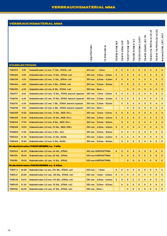 14VERBRAUCHSMATERIAL MMAL%u00e4nge Elektroden f%u00fcr Materialdicke T029958 GYSMI 80P T029972 GYSMI 130P T030077 GYSMI 160P T036635 GYSMI-E 163 T031210 GYSMI-E 200FV T064959 GYSARC-300 TRI T062054 TIG PROTIG 161 DC HF T063945 TIG PROTIG 201 AC/DC Multiweld 200M, 250T, 400TSTABELEKTRODENT084315 5.90 Stabelektroden 1,6 mm, 17 Stk., STAHL rutil 300 mm - 1,5mm X X X X X X X X XT084322 4.50 Stabelektroden 2,0 mm, 13 Stk., STAHL rutil 350 mm 1,5mm - 3,0mm X X X X X X X X XT084339 4.50 Stabelektroden 2,5 mm, 11 Stk., STAHL rutil 350 mm 2,5mm - 6,0mm X X X X X X X X XT084346 4.80 Stabelektroden 3,2 mm, 9 Stk., STAHL rutil 350 mm 5,0mm - 8,0mm X X X X X X X XT084353 6.00 Stabelektroden 4,0 mm, 8 Stk., STAHL rutil 350 mm 8mm + X X X X X X XT066717 6.60 Stabelektroden 2,0 mm, 13 Stk., STAHL basisch (spezial) 300 mm 1,5mm - 3,0mm X X X X X X X X XT066724 6.20 Stabelektroden 2,5 mm, 10 Stk., STAHL basisch (spezial) 350 mm 2,5mm - 6,0mm X X X X X X X X XT066731 6.30 Stabelektroden 3,2 mm, 7 Stk., STAHL basisch (spezial) 350 mm 5,0mm - 8,0mm X X X X X X X XT066748 7.20 Stabelektroden 4,0 mm, 6 Stk., STAHL basisch (spezial) 350 mm 8mm + X X X X X X XT082359 12.50 Stabelektroden 2,0 mm, 12 Stk., INOX 316 L 300 mm 1,5mm - 3,0mm X X X X X X X X XT082335 14.40 Stabelektroden 2,5 mm, 10 Stk., INOX 316 L 300 mm 2,5mm - 6,0mm X X X X X X X X XT082342 17.30 Stabelektroden 3,2 mm, 8 Stk., INOX 316 L 350 mm 5,0mm - 8,0mm X X X X X X X XT082328 13.00 Stabelektroden 2,5 mm, 10 Stk., INOX 308 L 300 mm 2,5mm - 6,0mm X X X X X X X X XT084803 11.50 Stabelektroden 3,2 mm, 5 Stk., ALU 350 mm 5,0mm - 8,0mm X X X X X X X XT083332 31.20 Stabelektroden 2,5 mm, 12 Stk., GUSS 350 mm 2,5mm - 6,0mm X X X X X X X X XT083349 37.80 Stabelektroden 3,2 mm, 9 Stk., GUSS 350 mm 5,0mm - 8,0mm X X X X X X X XStabelektroden PACKUNGEN ca. 1 kiloT081543 46.00 Stabelektroden 2,5 mm, 46 Stk., STAHL 450 mm HARTAUFTRAG X X X X X X X X XT081574 39.20 Stabelektroden 3,2 mm, 22 Stk., STAHL 450 mm HARTAUFTRAG X X X X X X X XT081581 39.20 Stabelektroden 4,0 mm, 14 Stk., STAHL 450 mm HARTAUFTRAG X X X X X X XStabelektroden PACKUNGEN ca. 2 kilosT085114 40.80 Stabelektroden 1,6 mm, 210 Stk., STAHL rutil 300 mm - 1,5mm X X X X X X X X XT085121 25.80 Stabelektroden 2,0 mm, 155 Stk., STAHL rutil 350 mm 1,5mm - 3,0mm X X X X X X X X XT085138 22.10 Stabelektroden 2,5 mm, 110 Stk., STAHL rutil 350 mm 2,5mm - 6,0mm X X X X X X X X XT085145 21.30 Stabelektroden 3,2 mm, 70 Stk., STAHL rutil 350 mm 5,0mm - 8,0mm X X X X X X X XT085152 22.90 Stabelektroden 4,0 mm, 47 Stk., STAHL rutil 350 mm 8mm + X X X X X X XVERBRAUCHSMATERIAL MMA