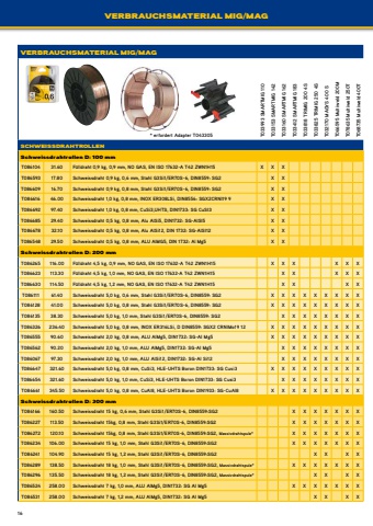 VERBRAUCHSMATERIAL MIG/MAGT033993 SMARTMIG 110 T033153 SMARTMIG 142 T033160 SMARTMIG 162 T033412 SMARTMIG 183 T033818 TRIMIG 200 4S T033825 TRIMIG 250 4S T032170 MAGYS 400 S T066595 Multiweld 200M T078635 Multiweld 250T T068735 Multiweld 400TSCHWEISSDRAHTROLLENSchweissdrahtrollen D: 100 mmT086104 31.60 F%u00fclldraht 0,9 kg, 0,9 mm, NO GAS, EN ISO 17632-A T42 ZWN1H15 X X XT086593 17.80 Schweissdraht 0,9 kg, 0,6 mm, Stahl G3Si1/ER70S-6, DIN8559: SG2 X XT086609 16.70 Schweissdraht 0,9 kg, 0,8 mm, Stahl G3Si1/ER70S-6, DIN8559: SG2 X XT086616 46.00 Schweissdraht 1,0 kg, 0,8 mm, INOX ER308LSi, DIN8556: SGX2CRNI19 9 X XT086692 97.40 Schweissdraht 1,0 kg, 0,8 mm, CuSi3,UHTS, DIN1733: SG CuSI3 X XT086685 29.40 Schweissdraht 0,5 kg, 0,8 mm, Alu AlSi5, DIN1732: SG-AISI5 X XT086678 32.10 Schweissdraht 0,5 kg, 0,8 mm, Alu AlSi12, DIN 1732: SG-AlSI12 X XT086548 29.50 Schweissdraht 0,5 kg, 0,8 mm, ALU AlMG5, DIN 1732: Al Mg5 X XSchweissdrahtrollen D: 200 mmT086265 116.00 F%u00fclldraht 4,5 kg, 0,9 mm, NO GAS, EN ISO 17632-A T42 ZWN1H15 X X X X X XT086623 113.30 F%u00fclldraht 4,5 kg, 1,0 mm, NO GAS, EN ISO 17632-A T42 ZWN1H15 X X X X XT086630 114.50 F%u00fclldraht 4,5 kg, 1,2 mm, NO GAS, EN ISO 17632-A T42 ZWN1H15 X X X XT086111 61.40 Schweissdraht 5,0 kg, 0,6 mm, Stahl G3Si1/ER70S-6, DIN8559: SG2 X X X X X X X X XT086128 41.00 Schweissdraht 5,0 kg, 0,8 mm, Stahl G3Si1/ER70S-6, DIN8559: SG2 X X X X X X X X XT086135 38.30 Schweissdraht 5,0 kg, 1,0 mm, Stahl G3Si1/ER70S-6, DIN8559: SG2 X X X X X X X XT086326 236.40 Schweissdraht 5,0 kg, 0,8 mm, INOX ER316LSi, D DIN8559: SGX2 CRNIMo19 12 X X X X X X X X XT086555 90.60 Schweissdraht 2,0 kg, 0,8 mm, ALU AIMg5, DIN1732: SG-AI Mg5 X X X X X X X X XT086562 90.20 Schweissdraht 2,0 kg, 1,0 mm, ALU AlMg5, DIN1732: SG-AI Mg5 X X X X X X X XT086067 97.30 Schweissdraht 2,0 kg, 1,0 mm, ALU AlSi12, DIN1732: SG-AI Si12 X X X X X X X XT086647 321.60 Schweissdraht 5,0 kg, 0,8 mm, CuSi3, HLE-UHTS Boron DIN1733: SG Cusi3 X X X X X X X X XT086654 321.60 Schweissdraht 5,0 kg, 1,0 mm, CuSi3, HLE-UHTS Boron DIN1733: SG Cusi3 X X X X X X X XT086661 345.50 Schweissdraht 5,0 kg, 0,8 mm, CuAl8, HLE-UHTS Boron DIN1933: SG-CuAl8 X X X X X X X X XSchweissdrahtrollen D: 300 mmT086166 160.50 Schweissdraht 15 kg, 0,6 mm, Stahl G3Si1/ER70S-6, DIN8559:SG2 X X X X X X XT086227 113.50 Schweissdraht 15kg, 0,8 mm, Stahl G3Si1/ER70S-6, DIN8559:SG2 X X X X X X XT086272 120.10 Schweissdraht 15kg, 0,8 mm, Stahl G3Si1/ER70S-6, DIN8559:SG2, Massivdrahtspule* X X X X X X XT086234 106.00 Schweissdraht 15 kg, 1,0 mm, Stahl G3Si1/ER70S-6, DIN8559:SG2 X X X X X X XT086241 104.90 Schweissdraht 15 kg, 1,2 mm, Stahl G3Si1/ER70S-6, DIN8559:SG2 X X X XT086289 138.50 Schweissdraht 18 kg, 1,0 mm, Stahl G3Si1/ER70S-6, DIN8559:SG2, Massivdrahtspule* X X X X X X XT086296 135.50 Schweissdraht 18 kg, 1,2 mm, Stahl G3Si1/ER70S-6, DIN8559:SG2, Massivdrahtspule* X X X XT086524 258.00 Schweissdraht 7 kg, 1,0 mm, ALU AlMg5, DIN1732: SG AI Mg5 X X X X X X XT086531 258.00 Schweissdraht 7 kg, 1,2 mm, ALU AlMg5, DIN1732: SG AI Mg5 X X X X16* erfordert Adapter T043305VERBRAUCHSMATERIAL MIG/MAG