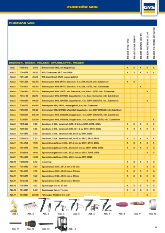 2323ZUBEH%u00d6R WIGZUBEH%u00d6R WIGT036635 GYSMI E163 T031210 GYSMI E200FV T064959 GYSARC-300 TRI T062054 PROTIG 161 DC HF T063945 TIG PROTIG 201 AC/DCBRENNER / D%u00dcSEN / H%u00dcLSEN / SPANNKAPPE / WAGENAbb.1 T045002 21.50 Brennerhalter WIG, mit Magnetfuss X X X X XAbb.2 T044678 26.50 WIG Zubeh%u00f6rset SR17 und SR26 X X X X XAbb.2 T044685 26.30 WIG Zubeh%u00f6rset SR20, wassergek%u00fchltAbb.3 T044425 160.70 Brennerpaket WIG SR17V, Gasventil, 4 m, DIN, 10/25, inkl. Zubeh%u00f6rset X XAbb.3 T044401 162.60 Brennerpaket WIG SR17V, Gasventil, 4 m, DIN, 35/50, inkl. Zubeh%u00f6rset XAbb.4 T044340 279.00 Brennerpaket WIG, SR17L, mit Starttaste, 8 m, Basic 35/50, inkl. Zubeh%u00f6rset XAbb.5 T046108 262.10 Brennerpaket WIG, SR17DB, Doppeltaster, 4 m, Euro-Connector, inkl. Zubeh%u00f6rsetAbb.6 T046030 199.00 Brennerpaket WIG, SR17DB, Doppeltaster, 4 m, GRIP DIN35/50, inkl. Zubeh%u00f6rset XAbb.6 T046153 426.90 Brennerpaket WIG, SR20L, wassergek%u00fchlt, 8 m, inkl. Zubeh%u00f6rsetAbb.6 T046009 187.20 Brennerpaket WIG, SR17DB, luftgek%u00fchlt, Doppeltaster, 4 m, GRIP DIN10/25, inkl. Zubeh%u00f6rsetAbb.6 T046054 275.00 Brennerpaket WIG, SR26DB, Doppeltaster, 4 m, GRIP DIN35/50, inkl. Zubeh%u00f6rsetAbb.7 T038271 320.50 Brennerpaket WIG, SR26DB, Doppeltaster, 4 m, Amphenol 35/50, inkl. Zubeh%u00f6rset XAbb.8 T045026 7.00 Gasd%u00fcsen, 3 Stk., keramisch GR5, D 8.0 zu SR17, SR18, SR26 X X X X XAbb.8 T045033 7.20 Gasd%u00fcsen, 3 Stk., keramisch GR7, D 11.0 zu SR17, SR18, SR26 X X X X XAbb.8 T044876 5.50 Gasd%u00fcsen, 3 Stk., keramisch N4, D 6.5 zu SR9, SR20Abb.8 T038400 7.20 Gasd%u00fcsen, 3 Stk., keramisch N6, D 9.5 zu SR17, SR18, SR26 X X X X XAbb.9 T044968 17.70 Spannh%u00fclsengeh%u00e4use 3 Stk., %u00d8 1.6 mm zu SR17, SR18, SR26 X X X X XAbb.9 T044975 17.70 Spannh%u00fclsengeh%u00e4use 3 Stk., %u00d8 2,0/2,4 mm zu SR17, SR18, SR26 X X X X XAbb.9 T045118 18.60 Spannh%u00fclsengeh%u00e4use 3 Stk., %u00d8 3,2 mm zu SR17, SR18, SR26 X XAbb.9 T044845 14.30 Spannh%u00fclsengeh%u00e4use 3 Stk., %u00d8 2,4 mm zu SR9, SR20Abb.10 T045040 5.40 Isolierring X X X X XAbb.11 T044982 7.60 Spannh%u00fclsen 3 Stk., %u00d8 1,6 mm x 50 mm X X X XAbb.11 T044999 7.70 Spannh%u00fclsen 3 Stk., %u00d8 2,0 mm x 50 mm X X X X XAbb.11 T045019 7.60 Spannh%u00fclsen 3 Stk., %u00d8 2,4 mm x 50mm X X X X XAbb.11 T045125 7.80 Spannh%u00fclsen 3 Stk., %u00d8 3.2 mm x 50 mm X XAbb.12 T044944 4.10 Spannkappe (kurz), 23 mm X X X X XAbb.13 T044951 5.40 Spannkappe (lang), 116 mm X X X X XAbb.14 T040281 267.80 Fahrwagen WELD 610 (4 m3) XAbb. 1 Abb. 2 Abb. 3 Abb. 4 Abb. 5 Abb. 6 Abb. 7 Abb. 8 Abb. 9 Abb. 10Abb. 11 Abb. 12 Abb. 13 Abb. 14