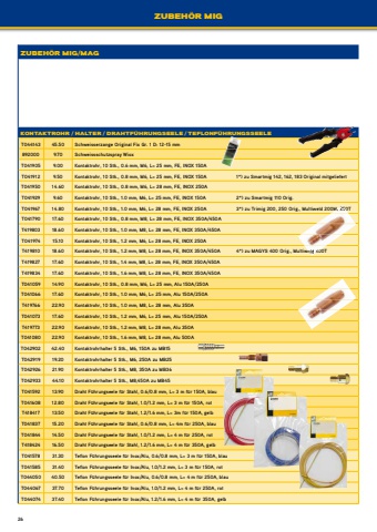 26ZUBEH%u00d6R MIGZUBEH%u00d6R MIG/MAGKONTAKTROHR / HALTER / DRAHTF%u00dcHRUNGSEELE / TEFLONF%u00dcHRUNGSSEELET044143 45.50 Schweisserzange Original Fix Gr. 1 D: 12-15 mm892000 9.70 Schweissschutzspray WioxT041905 9.00 Kontaktrohr, 10 Stk., 0.6 mm, M6, L= 25 mm, FE, INOX 150AT041912 9.50 Kontaktrohr, 10 Stk., 0.8 mm, M6, L= 25 mm, FE, INOX 150A 1*) zu Smartmig 142, 162, 183 Original mitgeliefertT041950 14.60 Kontaktrohr, 10 Stk., 0.8 mm, M6, L= 28 mm, FE, INOX 250AT041929 9.60 Kontaktrohr, 10 Stk., 1.0 mm, M6, L= 25 mm, FE, INOX 150A 2*) zu Smartmig 110 Orig.T041967 14.80 Kontaktrohr, 10 Stk., 1.0 mm, M6, L= 28 mm, FE, INOX 250A 3*) zu Trimig 200, 250 Orig., Multiweld 200M, 250TT041790 17.60 Kontaktrohr, 10 Stk., 0.8 mm, M8, L= 28 mm, FE, INOX 350A/450AT419803 18.60 Kontaktrohr, 10 Stk., 1.0 mm, M8, L= 28 mm, FE, INOX 350A/450AT041974 15.10 Kontaktrohr, 10 Stk., 1.2 mm, M6, L= 28 mm, FE, INOX 250AT419810 18.60 Kontaktrohr, 10 Stk., 1.2 mm, M8, L= 28 mm, FE, INOX 350A/450A 4*) zu MAGYS 400 Orig., Multiweld 400TT419827 17.60 Kontaktrohr, 10 Stk., 1.4 mm, M8, L= 28 mm, FE, INOX 350A/450AT419834 17.60 Kontaktrohr, 10 Stk., 1.6 mm, M8, L= 28 mm, FE, INOX 350A/450AT041059 14.90 Kontaktrohr, 10 Stk., 0.8 mm, M6, L= 25 mm, Alu 150A/250AT041066 17.60 Kontaktrohr, 10 Stk., 1.0 mm, M6, L= 25 mm, Alu 150A/250AT419766 22.90 Kontaktrohr, 10 Stk., 1.0 mm, M8, L= 28 mm, Alu 350AT041073 17.60 Kontaktrohr, 10 Stk., 1.2 mm, M6, L= 25 mm, Alu 150A/250AT419773 22.90 Kontaktrohr, 10 Stk., 1.2 mm, M8, L= 28 mm, Alu 350AT041080 22.90 Kontaktrohr, 10 Stk., 1.6 mm, M8, L= 28 mm, Alu 500AT042902 42.40 Kontaktrohrhalter 5 Stk., M6, 150A zu MB15T042919 19.20 Kontaktrohrhalter 5 Stk., M6, 250A zu MB25T042926 21.90 Kontaktrohrhalter 5 Stk., M8, 350A zu MB36T042933 44.10 Kontaktrohrhalter 5 Stk., M8,450A zu MB45T041592 13.90 Draht F%u00fchrungseele f%u00fcr Stahl, 0.6/0.8 mm, L= 3 m f%u00fcr 150A, blauT041608 12.80 Draht F%u00fchrungseele f%u00fcr Stahl, 1.0/1.2 mm, L= 3 m f%u00fcr 150A, rotT418417 13.50 Draht F%u00fchrungseele f%u00fcr Stahl, 1.2/1.6 mm, L= 3m f%u00fcr 150A, gelbT041837 15.20 Draht F%u00fchrungseele f%u00fcr Stahl, 0.6/0.8 mm, L= 4m f%u00fcr 250A, blauT041844 14.50 Draht F%u00fchrungseele f%u00fcr Stahl, 1.0/1.2 mm, L= 4 m f%u00fcr 250A, rotT418424 16.50 Draht F%u00fchrungseele f%u00fcr Stahl, 1.2/1.6 mm, L= 4 m f%u00fcr 350A, gelbT041578 31.30 Teflon F%u00fchrungsseele f%u00fcr Inox/Alu, 0.6/0.8 mm, L= 3 m f%u00fcr 150A, blauT041585 31.40 Teflon F%u00fchrungsseele f%u00fcr Inox/Alu, 1.0/1.2 mm, L= 3 m f%u00fcr 150A, rotT044050 40.50 Teflon F%u00fchrungsseele f%u00fcr Inox/Alu, 0.6/0.8 mm, L= 4 m f%u00fcr 250A, blauT044067 37.70 Teflon F%u00fchrungsseele f%u00fcr Inox/Alu, 1.0/1.2 mm, L= 4 m f%u00fcr 250A, rotT044074 37.40 Teflon F%u00fchrungsseele f%u00fcr Inox/Alu, 1.2/1.6 mm, L= 4 m f%u00fcr 350A, gelb3*) zu Trimig 200, 250 Orig., Multiweld 200M, 250T4*) zu MAGYS 400 Orig., Multiweld 400T