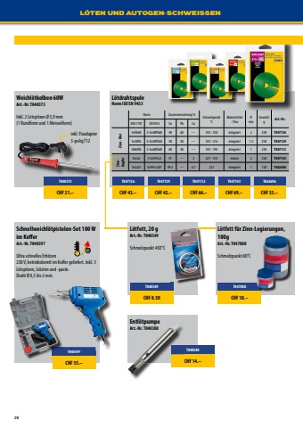 28L%u00d6TEN UND AUTOGEN-SCHWEISSENT040373CHF 21.%u2013WEICHL%u00d6TENWeichl%u00f6tkolben 60WArt.-Nr. T040373Inkl. 2 L%u00f6tspitzen %u00d8 5,9 mm(1 Rundform und 1 Meisselform)T040397CHF 55.%u2013Schnellweichl%u00f6tpistolen-Set 100 Wim KofierArt.-Nr. T040397Ultra schnelles Erhitzen230 V, betriebsbereit im Kofier geliefert. Inkl. 3 L%u00f6tspitzen, L%u00f6tzinn und -paste.Draht %u00d8 0,5 bis 2 mm.T040380CHF 14.%u2013Entl%u00f6tpumpeArt.-Nr. T040380T047136CHF 43.%u2013L%u00f6tdrahtspuleNorm ISO EN 9453Norm Zusammensetzung % Schmelzpunkt %u00b0CAbbeizmittel- Flux%u00d8mmGewichtgArt.-Nr.DIN 1707 EN 9453 Sn Pb CuZinn - BleiSnPb60 S-Sn40Pb60 40 60 --- 183 - 238 integriert 2 250 T047136Sn50Pb S-Sn50Pb50 50 50 --- 183 - 216 integriert 1.5 250 T047129SN60Pb S-Sn60Pb40 60 40 --- 183 - 190 integriert 1 250 T047112Zinn - KupferSnCu3 S-Sn97Cu3 97 --- 3 227 - 310 extern 2 250 T047143SnCu07 Sn993 Cu07 99.3 --- 0.7 227 integriert 1 100 T062696T047129CHF 42.%u2013T047112CHF 66.%u2013T047143CHF 69.%u2013T062696CHF 33.%u2013T040549CHF 8.50L%u00f6tfett, 20 gArt.-Nr. T040549Schmelzpunkt 450%u00b0CT047808CHF 18.%u2013L%u00f6tfett f%u00fcr Zinn-Legierungen, 100gArt.-Nr. T047808Schmelzpunkt 80%u00b0Cinkl. Fixadapter3-polig T12