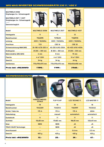 MIG MAG INVERTER SCHWEISSGER%u00c4TE 230 V / 400 VMULTIWELD 200MEinphasiges Inv. Schweissger%u00e4tMULTIWELD 250T / 400TDreiphasiges Inv. Schweissger%u00e4t-----GeneratortauglichModell MULTIWELD 200M MULTIWELD 250T MULTIWELD 400TKatalogseite 11 11 12Bestellnummer T066595 T078635 T068735Leistung 230V / 50/60Hz 400V / 50/60Hz 400V / 50/60HzAnschluss T23 CEE 16 CEE 32Schweissleistung MMA/MIG 30-180 A/30-200 A 40-250 A/40-250A 40-400 A/40-400ADrahtspulen %u00d8 200 + 300 mm %u00d8 200 + 300 mm %u00d8 200 + 300 mmMaterialst%u00e4rke MIG-MAG 6 mm 8 mm 15 mmFlasche 4 m3 (20l) 4 m3 (20l) 10 m3 (50l)Gewicht 34 kg 34 kg 64 kgGer%u00e4temass 770x790x470 mm 770x790x470 mm 910x930x550 mmPreis inkl. vRG/MWSt 1%u2018590.%u2013 1%u2018999.%u2013 3%u2018560.%u2013Modell HANDSCHWEISS,SCHILD FLIP-FLAP LCD TECHNO 11 LCD MASTER 11Katalogseite 18 18 18 18Bestellnummer T042209 T042513 T064997 T043442Schild / Helm bis 175 A 175 A 175 A 200AAbdunkelung --- manuell automatisch automatischDunkelstufe 11 11 11 11Sichtfeld 93x38 mm 97x80 mm 98x35 mm 100x49 mmSolar NEIN NEIN JA JATRUE COLOR Technologie --- NEIN JA JAVerschlusszeit --- --- 0.6 ms 0.5 msGewicht 400 g 425 g 420 g 430 gPreis inkl. vRG/MWSt 13.%u2013 25.%u2013 39.%u2013 47.%u2013SCHWEISSSCHUTZ4