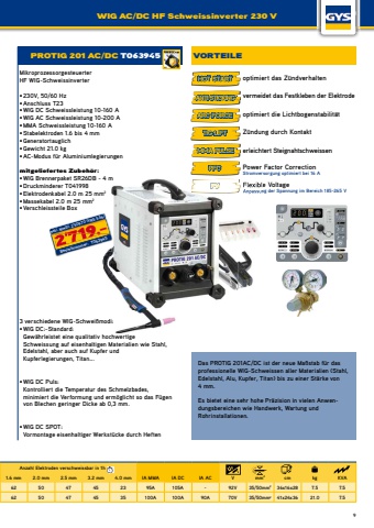 Anzahl Elektroden verschweissbar in 1h 1.6 mm 2.0 mm 2.5 mm 3.2 mm 4.0 mm IA MMA IA DC IA AC V mm2 cm kg KVA62 50 47 45 23 95A 105A - 92V 35/50mm2 36x16x28 7.5 7.562 50 47 45 35 100A 100A 90A 70V 35/50mm2 41x24x36 21.0 7.5WIG AC/DC HF 9 Schweissinverter 230 V9VORTEILEoptimiert das Z%u00fcndverhaltenvermeidet das Festkleben der Elektrodeoptimiert die Lichtbogenstabilit%u00e4tZ%u00fcndung durch Kontakterleichtert SteignahtschweissenPower Factor CorrectionStromversorgung optimiert bei 16 AFlexible VoltageAnpassung der Spannung im Bereich 185-265 VHOT STARTARC FORCEANTI STICKINGTIG LIFTMMA PULSEPFCFV Flexible VoltageAnpassung der Spannung im Bereich 185-265 V2%u2018719.%u2013exkl. MwSt. 2%u2018509.70 (VRG 5.56)Bestellnummer: T063945MikroprozessorgesteuerterHF WIG-Schweissinverter%u2022230V, 50/60 Hz%u2022Anschluss T23%u2022WIG DC Schweissleistung 10-160 A%u2022WIG AC Schweissleistung 10-200 A%u2022MMA Schweissleistung 10-160 A%u2022Stabelektroden 1.6 bis 4 mm%u2022Generatortauglich%u2022Gewicht 21.0 kg%u2022AC-Modus f%u00fcr Aluminiumlegierungenmitgeliefertes Zubeh%u00f6r:%u2022WIG Brennerpaket SR26DB - 4 m%u2022Druckminderer T041998%u2022Elektrodenkabel 2.0 m 25 mm2%u2022Massekabel 2.0 m 25 mm2%u2022Verschleissteile BoxDas PROTIG 201AC/DC ist der neue Ma%u00dfstab f%u00fcr das professionelle WIG-Schweissen aller Materialien (Stahl, Edelstahl, Alu, Kupfer, Titan) bis zu einer St%u00e4rke von4 mm.Es bietet eine sehr hohe Pr%u00e4zision in vielen Anwendungsbereichen wie Handwerk, Wartung undRohrinstallationen.3 verschiedene WIG-Schwei%u00dfmodi:%u2022WIG DC:-Standard:Gew%u00e4hrleistet eine qualitativ hochwertigeSchweissung auf eisenhaltigen Materialien wie Stahl,Edelstahl, aber auch auf Kupfer undKupferlegierungen, Titan...%u2022WIG DC Puls:Kontrolliert die Temperatur des Schmelzbades,minimiert die Verformung und erm%u00f6glicht so das F%u00fcgen von Blechen geringer Dicke ab 0,3 mm.%u2022WIG DC SPOT:Vormontage eisenhaltiger Werkst%u00fccke durch HeftenPROTIG 201 AC/DC T063945