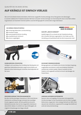 10D12Wer sich f%u00fcr die Marke Kr%u00e4nzle entscheidet, erh%u00e4lt immer ausgereifte Hochdruckreiniger, die auf der ganzen Linie %u00fcberzeugen. In unserem s%u00fcddeutschen Produktionsstandort Illertissen wird jeder Hochdruckreiniger von Hand %u00fcberpr%u00fcft, bevor er das Werk verl%u00e4sst. So garantieren wir Anwendern h%u00f6chste Qualit%u00e4t, souver%u00e4ne Reinigungskraft und besonders lange Lebensdauer.AUF KR%u00c4NZLE IST EINFACH VERLASSQUALIT%u00c4T BIS IN JEDES DETAILLANGSAM LAUFENDER ELEKTROMOTORSparsam, leise und langlebig: Die besonders leistungsstarken Hochdruckreiniger f%u00fcr den Dauerbetrieb sind mit einem 4-poligen Elektromotor ausger%u00fcstet. Seine niedrige Drehzahl von 1400 U/min reduziert den Anlaufstrom, sorgt damit f%u00fcr weniger Verschlei%u00df und senkt die Ger%u00e4uschentwicklung.DRUCKREGULIERUNG | EDELSTAHLMANOMETERBei allen Hochdruckreinigern (Ausnahme K 1050-Serie) k%u00f6nnen Arbeitsdruck und Wassermenge individuell dem jeweiligen Einsatz angepasst werden. Mit dem gro%u00dfdimensionierten Edelstahlmanometer l%u00e4sst sich der eingestellte Arbeitsdruck %u00fcbersichtlich ablesen. Es enth%u00e4lt eine Glycerinfl%u00fcssigkeit, die m%u00f6gliche Schwankungen des Zeigers d%u00e4mpft.SCHNELLWECHSEL-STECKSYSTEM Intelligent und zuverl%u00e4ssig: Das Schnellwechsel-Stecksystem mit geh%u00e4rteten Edelstahlkomponenten sorgt f%u00fcr die einfache und jederzeit sichere Verbindung der Sicherheits-Abschaltpistole mit der Lanze. DIE KR%u00c4NZLE PRODUKTVORTEILE%u25a0hochwertige Materialien und Verarbeitung %u25a0innovatives Design%u25a0anwendungsfreundliches Handling%u25a0umweltbewusster Verbrauch%u25a0extreme LanglebigkeitQualit%u00e4t beginnt f%u00fcr uns bereits bei der Produktentwicklung, die im Standort Illertissen angesiedelt ist. Dort finden auch die Herstellung und Qualit%u00e4tskontrolle fast aller Komponenten statt. QUALIT%u00c4T %u201eMADE IN GERMANY%u201c SECHSKANT VERDREHSICHERUNGReinigungslanzen und Zubeh%u00f6r, die mit einer Sechskant-Kupplung ausgestattet sind, k%u00f6nnen in sechs verschiedenen Positionen verdrehsicher arretiert werden. Dadurch verdreht sich das Zubeh%u00f6r nicht ungewollt und l%u00e4sst sich durch das Bewegen der Pistole f%u00fchren.