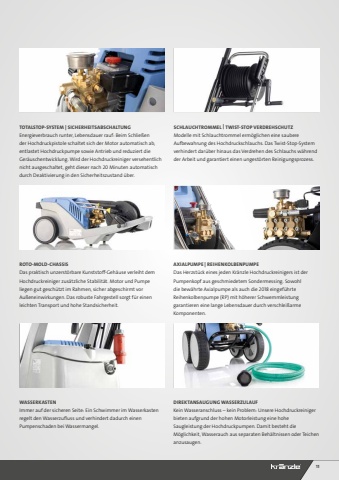 11TOTALSTOP-SYSTEM | SICHERHEITSABSCHALTUNGEnergieverbrauch runter, Lebensdauer rauf: Beim Schlie%u00dfen der Hochdruckpistole schaltet sich der Motor automatisch ab, entlastet Hochdruckpumpe sowie Antrieb und reduziert die Ger%u00e4uschentwicklung. Wird der Hochdruckreiniger versehentlich nicht ausgeschaltet, geht dieser nach 20 Minuten automatisch durch Deaktivierung in den Sicherheitszustand %u00fcber.DIREKTANSAUGUNG WASSERZULAUFKein Wasseranschluss %u2013 kein Problem: Unsere Hochdruckreiniger bieten aufgrund der hohen Motorleistung eine hoheSaugleistung der Hochdruckpumpen. Damit besteht die M%u00f6glichkeit, Wasserauch aus separaten Beh%u00e4ltnissen oder Teichen anzusaugen.ROTO-MOLD-CHASSISDas praktisch unzerst%u00f6rbare Kunststoff-Geh%u00e4use verleiht dem Hochdruckreiniger zus%u00e4tzliche Stabilit%u00e4t. Motor und Pumpe liegen gut gesch%u00fctzt im Rahmen, sicher abgeschirmt vor Au%u00dfeneinwirkungen. Das robuste Fahrgestell sorgt f%u00fcr einen leichten Transport und hohe Standsicherheit.WASSERKASTENImmer auf der sicheren Seite: Ein Schwimmer im Wasserkasten regelt den Wasserzufluss und verhindert dadurch einen Pumpenschaden bei Wassermangel.SCHLAUCHTROMMEL | TWIST-STOP VERDREHSCHUTZModelle mit Schlauchtrommel erm%u00f6glichen eine saubere Aufbewahrung des Hochdruckschlauchs. Das Twist-Stop-System verhindert dar%u00fcber hinaus das Verdrehen des Schlauchs w%u00e4hrend der Arbeit und garantiert einen ungest%u00f6rten Reinigungsprozess.AXIALPUMPE | REIHENKOLBENPUMPEDas Herzst%u00fcck eines jeden Kr%u00e4nzle Hochdruckreinigers ist der Pumpenkopf aus geschmiedetem Sondermessing. Sowohl die bew%u00e4hrte Axialpumpe als auch die 2018 eingef%u00fchrte Reihenkolbenpumpe (RP) mit h%u00f6herer Schwemmleistung garantieren eine lange Lebensdauer durch verschlei%u00dfarme Komponenten.