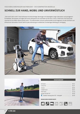 1214-1516-1718-1920-2122-2324-2526-27%u201eGeht nicht? Gibt%u2019s nicht!%u201c: Diese Kaltwasser-Hochdruckreiniger %u00fcberzeugen mit Vielseitigkeit, langer Lebensdauer und praxisgerechter Mobilit%u00e4t. Ob kompakt und tragbar (HD-Serie), platzsparend mit zwei R%u00e4dern (K 1152-Serie, X-Serie, K 2000-Serie, Profi-Serie) oder universell mit vier R%u00e4dern (kleine quadro-Serie) %u2013 im professionellen und semi-professionellen Einsatz begeistern sie den Fachmann und erfreuen den Heimwerker. Kr%u00e4nzle stellt f%u00fcr jede Anwendung ein verl%u00e4ssliches, hochwertiges Werkzeug zur Verf%u00fcgung.SCHNELL ZUR HAND, MOBIL UND UNVERW%u00dcSTLICHHOCHDRUCKREINIGER KALTWASSER %u2013 DIE KOMPAKTEN MODELLEINHALTSANGABEHD-Serie ....................................................................................................K 1152 TST...................................................................................................X-Serie ........................................................................................................K 2000-Serie ............................................................................................Profi-Serie .................................................................................................quadro 10/130 TST................................................................................. Zubeh%u00f6r Stecksystem D12 - Kompakt ...................................BRANCHENSCHWERPUNKTE
