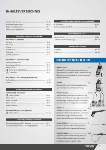 304-0506-070810-1190-919426-2768-8614-1516-1718-1920-2122-2324-2530-3132-3334-3738-3940-4144-4748-4952-5354-5556-5758-5960-6164-6598-99100-101104-105106-10780-817570-7198-9934-3718-19TELESKOPLANZE.......................................................Die Teleskoplanze bietet eine bequeme und effektive L%u00f6sung zur Reinigung von schwer erreichbaren Stellen in gro%u00dfer H%u00f6he.VENTOS 32 L/PC .......................................................Die Industriestaubsauger sind sowohl f%u00fcr die Trocken- als auch Nasssaugung geeignet, bieten ein vielf%u00e4ltiges Zubeh%u00f6rprogramm und sind mit einer Vielzahl von Elektroger%u00e4ten kompatibel.STARLET 4 ...................................................................Die neue Sicherheits-Abschaltpistole f%u00fcr das Stecksystem D12 %u00fcberzeugt nicht nur mit ihrem schlankeren Design, sondern punktet auch in Sachen Ergonomie und Nutzerkomfort. VARIO-JET DUO ........................................................Bei der neuen Vario-Jet Duo kann zwischen Punkt- und Flachstrahl gewechselt werden.INHALTSVERZEICHNISKr%u00e4nzle stellt sich vor.........................................................................Branchenschwerpunkte...................................................................Digitaler Produktberater..................................................................Qualit%u00e4t bis in jedes Detail..............................................................Zubeh%u00f6r Stecksystem D12 - Kompakt ........................................Zubeh%u00f6r Stecksystem D12 - Gesamtprogramm .....................KALTWASSER - KOMPAKTHD-Serie .................................................................................................K 1152 TST................................................................................................X-Serie .....................................................................................................K 2000-Serie .........................................................................................Profi-Serie quadro 10/130 TST..............................................................................KALTWASSER - LEISTUNGSSTARKmittlere quadro-Serie .......................................................................grosse quadro-Serie Primus-Serie ......................................................................................... WS-RP-Serie | WSC-RP-Serie ................................................... LX-RP-Serie ....................................................................................KALTWASSER - MIT VERBRENNUNGSMOTORProfi-Jet-Serie .......................................................................................B-Serie .....................................................................................................HEISSWASSER - %u00d6L BEHEIZT therm-RP-Serie ............................................................................therm-1-Serie ........................................................................................therm 1017-Serie ..................................................................................therm-C-Serie therm-CA-Serie ....................................................................................HEISSWASSER - ELEKTRISCH BEHEIZT e-therm-Serie ..............................................................................K 1050-Serie ............................................................................................Zubeh%u00f6r Stecksystem D10 Colly 800 .................................................................................................Kr%u00e4nzle 1+1 Ventos 32 L/PC ......................................................................................Zubeh%u00f6r Industriestaubsauger HOCHDRUCKREINIGER KALTWASSERHOCHDRUCKREINIGER HEISSWASSERHOCHDRUCKREINIGER F%u00dcR PRIVATANWENDERHOCHDRUCKREINIGER ZUBEH%u00d6RHANDKEHRMASCHINENINDUSTRIESTAUBSAUGERPRODUKTNEUHEITENPRIMUS-SERIE...........................................................Die neue Primus-Serie %u00fcberzeugt durch seine robuste Bauform und seine hohe Schwemmleistung.Dadurch werden auch gr%u00f6bste Verschmutzungen m%u00fchelos entfernt. X-SERIE.........................................................................Die neue X-Serie bietet Reinigungsleistungen und Bedienbarkeit auf h%u00f6chstem Niveau.