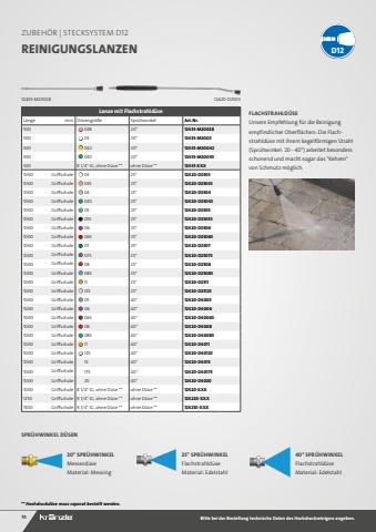26500%u25cf02820%u00b012435-M20028500%u25cf03 20%u00b012435-M2003500%u25cf04220%u00b012435-M20042500%u25cf045 20%u00b012435-M20045500%u25cf02812433-028500%u25cf0312433-03500%u25cf04212433-042500%u25cf02812438-028500%u25cf0312438-03500%u25cf04212438-042500%u25cf04512438-045500%u25cf0512438-05500%u25cf05512438-05512525210 | 2120100D12132600285x19011353032135313135303135313Bitte bei der Bestellung technische Daten des Hochdruckreinigers angeben.VARIABLES ZUBEH%u00d6RF%u00dcR VIELF%u00c4LTIGE ANWENDUNGENZUBEH%u00d6R | STECKSYSTEM D12 - KOMPAKTPraktisch und wendig: Reinigungslanzen und Zubeh%u00f6r, die mit der Verdrehsicherung ausgestattet sind, k%u00f6nnen in sechs verschiedenen Positionen verdrehsicher arretiert werden.Lanze mit Flachstrahld%u00fcseL%u00e4nge mm D%u00fcsengr%u00f6%u00dfe Spr%u00fchwinkelArt.Nr.Lanze mit Vario-Jet DuoL%u00e4ngemm D%u00fcsengr%u00f6%u00dfeArt.Nr.Lanze mit SchmutzkillerL%u00e4ngemm D%u00fcsengr%u00f6%u00dfeArt.Nr.Starlet 4Art.Nr. EingangM22x1.5 AGAusgangSteckkupplung D12Arbeitsdruck max. bar | MPaWasserleistung max.l/minTemperatur max.%u00b0CSpritzschutz%u25a0 verwendbar f%u00fcr alle WaschlanzenArt.Nr. Unten LxB mmSchaumlanzeErzeugung von wirksamem Schaum %u25a0 verstellbarer Spr%u00fchwinkel (Punktstrahl - Flachstrahl)%u25a0 inkl. SchraubverschlussBeh%u00e4lter LiterArt.Nr.%u25ba WEITERES ZUBEH%u00d6R ab Seite 68Reinigungsmittel: S. 79NEU!NEU!
