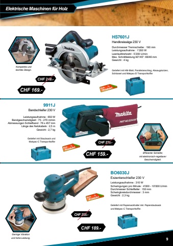 CHF 169.- CHF 249.- CHF 159.- CHF 235.- CHF 189.- CHF 285.- Elektrische Maschinen f%u00fcr HolzHS7601JHandkreiss%u00e4ge 230 VDurchmesser Trennscheibe : 190 mmLeistungsaufnahme : 1%u2019200 WLeerlaufdrehzahl : 5%u2019200 U/minMax. Schnittleistung 90%u00b0/45%u00b0: 66/46 mmGewicht : 4 kgGeliefert mit HM-Blatt, Parallelanschlag, Absaugstutzen, Schl%u00fcssel und Makpac-D Transportkoffer9911JBandschleifer 230 VLeistungsaufnahme : 650 WBandgeschwindigkeit : 75 - 270 m/minAbmessungen Schleifband : 76 x 457 mmL%u00e4nge des Netzkabels : 2,5 mGewicht : 2,7 kgGeliefert mit Staubsack und Makpac-C TransportkofferBO6030JExzenterschleifer 230 VLeistungsaufnahme : 310 WSchwingungen pro Minute : 4%u2019000 - 10%u2019000 U/minDurchmesser Schleifteller : 150 mmSchwingkreisdurchmesser : 3 mm Gewicht : 2,3 kgGeliefert mit Papiersackhalter inkl. Papierstaubsack und Makpac-C Transportkoffer.Kompaktes und leichtes Design.Effizienter Schleifer, mit elektronisch-regelbarer Geschwindigkeit.Geringe Vibration und hohe Leistung. 9