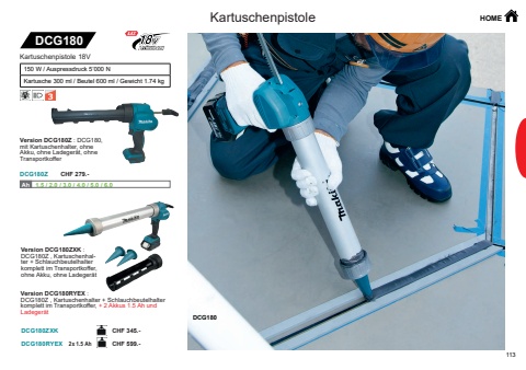 113DCG180ZDCG180ZXKDCG180RYEX 2x 1.5 AhDCG180DCG180Ah Ah 1.5 / 2.0 / 3.0 / 4.0 / 5.0 / 6.0 Kartuschenpistole HOMEKartuschenpistole 18V150 W / Auspressdruck 5%u2019000 NKartusche 300 ml / Beutel 600 ml / Gewicht 1.74 kgVersion DCG180Z : DCG180, mit Kartuschenhalter, ohne Akku, ohne Ladeger%u00e4t, ohne TransportkofferVersion DCG180ZXK : DCG180Z , Kartuschenhalter + Schlauchbeutelhalter komplett im Transportkoffer, ohne Akku, ohne Ladeger%u00e4tVersion DCG180RYEX : DCG180Z , Kartuschenhalter + Schlauchbeutelhalter komplett im Transportkoffer, + 2 Akkus 1.5 Ah und Ladeger%u00e4tCHF 599.-CHF 279.-CHF 345.-