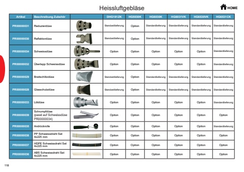 118Heissluftgebl%u00e4se HOMEArtikel Beschreibung Zubeh%u00f6r DHG181ZK HG5030K HG6030K HG6031VK HG6530VK HG6531CKPR00000031 Reduzierd%u00fcse Standardlieferung Option Standardlieferung Standardlieferung Standardlieferung StandardlieferungPR00000030 Reflektord%u00fcse Standardlieferung Option Standardlieferung Standardlieferung Standardlieferung StandardlieferungPR00000034 Schweissd%u00fcse Option Option Option Option Option StandardlieferungPR00000032 %u00dcberlapp Schweissd%u00fcse Option Option Option Option Option StandardlieferungPR00000029 Breitschlitzd%u00fcse Standardlieferung Option Standardlieferung Standardlieferung Standardlieferung StandardlieferungPR00000028 Glasschutzd%u00fcse Standardlieferung Option Standardlieferung Standardlieferung Standardlieferung StandardlieferungPR00000033 L%u00f6td%u00fcse Option Option Option Option Option StandardlieferungPR00000039Schrumpfd%u00fcse (passt auf Schweissd%u00fcse PR00000034)Option Option Option Option Option OptionPR00000035 Andr%u00fcckrolle Option Option Option Option Option StandardlieferungPR00000038 PP Schweissdraht Set 4x225 mm Option Option Option Option Option OptionPR00000037 HDPE Schweissdraht Set 4x225 mm Option Option Option Option Option OptionPR00000036 ABS Schweissdraht Set 4x225 mm Option Option Option Option Option Option