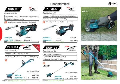 142DUR181DUR181ZDUR181RM 1x 4.0 AhDUR193DUR193ZDUR193RF 1x 3.0 AhAh Ah 1.5 / 2.0 / 3.0 / 4.0 / 5.0 / 6.0 Ah Ah 1.5 / 2.0 / 3.0 / 4.0 / 5.0 / 6.0 DUM111 DUM604 1x 3.0 AhDUM111ZXDUM111RFXDUM604ZXDUM604RFX 1x 3.0 AhAh Ah 1.5 / 2.0 / 3.0 / 4.0 / 5.0 / 6.0 Ah Ah 1.5 / 2.0 / 3.0 / 4.0 / 5.0 / 6.0 DUM111DUR193HOMEAkku-Trimmer 18V7%u2019800 U/min / Max. Schnittbreite 260 mm Verstellbares Teleskoprohr drehbar um 180%u00b0 / 3.1 kgMit 1-Faden Spule 280 W / / %u00d8 Schnitt 260 mm 7%u2019800 U/min M8 x 1.25 RH / 1.96 kgAutonomie mit 6.0 Ah : 50 minRasentrimmer 18VRasentrimmerMit 1-Faden SpuleSchnittbreite 11 cm / 3 Schnitth%u00f6hen 15/20/25 mm 2%u2019500 U/min / Gewicht 1.03 kgDrehzahl 1%u2019250 U/min / 3 Schnitth%u00f6hen 15/20/25 mm Schnittbreite 16 cm / Gewicht 1.18 kgRasenschere 18V Rasenschere 18VGeliefert mit 2 Messer (f%u00fcr Gras + f%u00fcr Hecke) Geliefert mit 2 Messer (f%u00fcr Gras + f%u00fcr Hecke)FreischneiderCHF 319.-CHF 119.-CHF 269.-CHF 125.-CHF 245.-CHF 89.-CHF 259.-CHF 115.-
