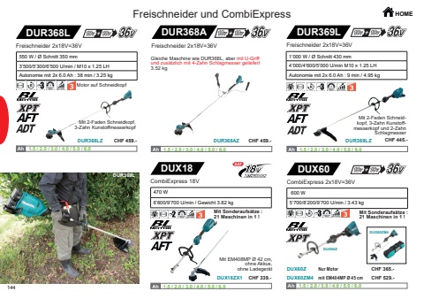 144DUX18ZX1DUX18Ah Ah 1.5 / 2.0 / 3.0 / 4.0 / 5.0 / 6.0 DUX60DUX60ZM4DUX60ZDUX60ZM4DUX60ZAh Ah 1.5 / 2.0 / 3.0 / 4.0 / 5.0 / 6.0 DUR368L DUR368A DUR369LDUR368LZ DUR368AZ DUR369LZAh Ah 1.5 / 2.0 / 3.0 / 4.0 / 5.0 / 6.0 Ah Ah 1.5 / 2.0 / 3.0 / 4.0 / 5.0 / 6.0 Ah Ah 1.5 / 2.0 / 3.0 / 4.0 / 5.0 / 6.0 DUR369LHOMECombiExpress 18V470 W 6%u2019800/9%u2019700 U/min / Gewicht 3.82 kg Mit EM408MP %u00d8 42 cm, ohne Akkus, ohne Ladeger%u00e4tMit Sonderaufs%u00e4tze :21 Maschinen in 1 ! 600 W 5%u2019700/8%u2019200/9%u2019700 U/min / 3.43 kgCombiExpress 2x18V=36VMit Sonderaufs%u00e4tze :21 Maschinen in 1 !Nur Motormit EM404MP %u00d8 45 cmMit 2-Faden Schneidkopf, 3-Zahn KunstoffmesserkopfFreischneider 2x18V=36V550 W / %u00d8 Schnitt 350 mm3%u2019500/5%u2019300/6%u2019500 U/min / M10 x 1.25 LH Autonomie mit 2x 6.0 Ah : 38 min / 3.25 kg 1%u2019000 W / %u00d8 Schnitt 430 mm4%u2019000/4%u2019600/5%u2019000 U/min M10 x 1.25 LHAutonomie mit 2x 6.0 Ah : 9 min / 4.95 kg Freischneider 2x18V=36VMit 2-Faden Schneid- kopf, 3-Zahn Kunstoff- messerkopf und 2-Zahn SchlagmesserFreischneider und CombiExpressGleiche Maschine wie DUR368L, aber mit U-Griffund zus%u00e4tzlich mit 4-Zahn Schlagmesser geliefert3.52 kgFreischneider 2x18V=36VMotor auf SchneidkopfCombiExpressCHF 339.- CHF 529.-CHF 365.-CHF 459.- CHF 459.- CHF 445.-