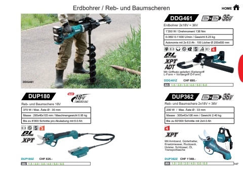 147DUP180DUP180ZAh Ah 1.5 / 2.0 / 3.0 / 4.0 / 5.0 / 6.0 DUP362DUP362ZAh Ah 1.5 / 2.0 / 3.0 / 4.0 / 5.0 / 6.0 DDG461ZDDG461Ah Ah 1.5 / 2.0 / 3.0 / 4.0 / 5.0 / 6.0 DDG461Erdbohrer / Reb- und Baumscheren HOMEReb- und Baumschere 18V370 W / Max. %u00c4ste %u00d8 : 30 mmMasse : 295x40x105 mm / Maschinengewicht 0.95 kgBis zu 8%u2019000 Schnitte pro Akuladung mit 6.0 Ah200 W / Max. %u00c4ste %u00d8 : 33 mmMasse : 305x43x106 mm / Gewicht 2.40 kgBis zu 60%u2019000 Schnitte mit 2x4.0 AhReb- und Baumschere 2x18V = 36VMit Armband, G%u00fcrtelhalter, Ersatzmesser, Rucksack, Holster, Schl%u00fcssel, %u00d6l, Transporttasche1%u2019350 W / Drehmoment 136 Nm0-350/ 0-1%u2019400 U/min / Gewicht 6.23 kg Autonomie mit 2x 6.0 Ah : 100 L%u00f6cher %u00d8 200x600 mm Erdbohrer 2x18V = 36VMit Griffsatz geliefert (Seitengriff L-Form + Vordergriff D-Form) CHF 825.- CHF 1%u2019369.-CHF 695.-