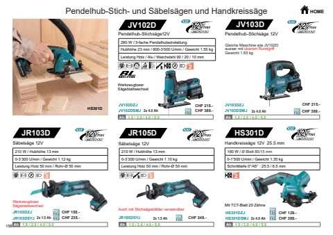 158JV102D JV103DHS301D 2x 4.0 AhJV102DZJJV102DSMJ 2x 4.0 AhJV103DZJJV103DSMJAh Ah 1.5 / 2.0 / 4.0 / 5.0 Ah Ah 1.5 / 2.0 / 4.0 / 5.0 JR103DZJJR103D JR105DJR103DSYJ 2x 1.5 Ah JR105DSYJ 2x 1.5 AhAh Ah 1.5 / 2.0 / 4.0 / 5.0 Ah Ah 1.5 / 2.0 / 4.0 / 5.0 HS301D2x 4.0 AhHS301DZJHS301DSMJAh Ah 1.5 / 2.0 / 4.0 / 5.0Pendelhub-Stich- und S%u00e4bels%u00e4gen und Handkreiss%u00e4ge HOMEPendelhub-Stichs%u00e4ge12V280 W / 3-fache PendelhubeinstellungHubh%u00f6he 23 mm / 800-3%u2019000 U/min / Gewicht 1.55 kgLeistung Holz / Alu / Weichstahl 90 / 20 / 10 mmPendelhub-Stichs%u00e4ge 12VGleiche Maschine wie JV102Dausser mit oberem RundgriffGewicht 1.65 kgWerkzeugloser S%u00e4geblattwechsel210 W / Hubh%u00f6he 13 mm0-3%u2019300 U/min / Gewicht 1.12 kgLeistung Holz 50 mm / Rohr-%u00d8 50 mm S%u00e4bels%u00e4ge 12V210 W / Hubh%u00f6he 13 mm0-3%u2019300 U/min / Gewicht 1.10 kgLeistung Holz 50 mm / Rohr-%u00d8 50 mm S%u00e4bels%u00e4ge 12VAuch mit Stichs%u00e4gebl%u00e4tter verwendbarWerkzeugloser S%u00e4geblattwechsel160 W / %u00d8 Blatt 85/15 mm0-1%u2019500 U/min / Gewicht 1.35 kgSchnitttiefe 0%u00b0/45%u00b0 : 25.5 / 6.5 mmHandkreiss%u00e4ge 12V 25.5 mmMit TCT-Blatt 20 Z%u00e4hneHolzs%u00e4genCHF 389.-CHF 215.-CHF 389.-CHF 215.-CHF 155.-CHF 235.- CHF 249.- CHF 309.-CHF 129.-