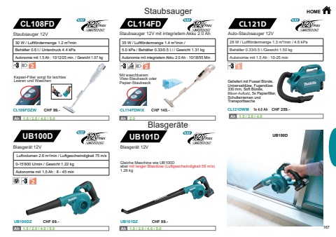 167CL108FDZW CL114FDWIXCL108FD CL114FDAh Ah 1.5 / 2.0 / 4.0 / 5.0 Ah Ah 2.0CL121DCL121DWM 1x 4.0 AhAh Ah 1.5 / 2.0 / 4.0UB100DZUB100DAh Ah 1.5 / 2.0 / 4.0 / 5.0UB101DZUB101DAh Ah 1.5 / 2.0 / 4.0 / 5.0UB100DStaubsauger HOMEStaubsauger 12V30 W / Luftf%u00f6rdermenge 1.2 m3/minBeh%u00e4lter 0.6 l / Unterdruck 4.4 kPaAutonomie mit 1.5 Ah : 10/12/25 min. / Gewicht 1.07 kgStaubsauger 12V mit integrietem Akku 2.0 Ah 35 W / Luftf%u00f6rdermenge 1.4 m3/min / 5.0 kPa / Beh%u00e4lter 0.33/0.5 l / / Gewicht 1.31 kgAutonomie mit integrietem Akku 2.0 Ah : 10/18/55 MinMit waschbarem Vlies-Staubsack oder Papier-StaubsackKapsel-Filter sorgt f%u00fcr leichtes Leeren und WaschenAuto-Staubsauger 12V28 W / Luftf%u00f6rdermenge 1.3 m%u00b3/min / 4.6 kPa Beh%u00e4lter 0.33/0.5 l /Gewicht 1.50 kgAutonomie mit 1.5 Ah : 10-25 min Geliefert mit Fussel B%u00fcrste, Universald%u00fcse, Fugend%u00fcse 330 mm, Soft B%u00fcrste, Bl%u00e4ser-Aufsatz, 5x Papierfilter, Schulterriemen und Transporttasche Luftvolumen 2.6 m3/min / Luftgeschwindigkeit 75 m/s 0-15%u2019800 U/min / Gewicht 1.22 kgAutonomie mit 1,5 Ah : 8 - 45 minBlasger%u00e4t 12V Blasger%u00e4t 12VGleiche Maschine wie UB100Daber mit langer Blasd%u00fcse (Luftgeschwindigkeit 56 m/s)1.28 kgBlasger%u00e4teCHF 99.- CHF 145.- CHF 259.-CHF 69.- CHF 89.-