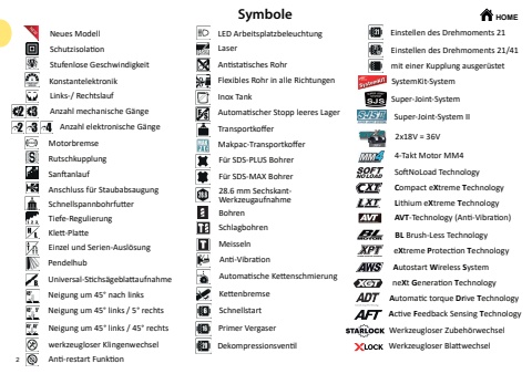 2Neues ModellStufenlose GeschwindigkeitKonstantelektronikLinks-/ RechtslaufAnzahl mechanische G%u00e4ngeAnzahl elektronische G%u00e4ngeMotorbremseRutschkupplungSanftanlaufAnschluss f%u00fcr StaubabsaugungSchnellspannbohrfutterTiefe-RegulierungKlett-PlatteEinzel und Serien-Ausl%u00f6sungPendelhubUniversal-Stichs%u00e4geblattaufnahmeNeigung um 45%u00b0 nach linksNeigung um 45%u00b0 links / 5%u00b0 rechtsNeigung um 45%u00b0 links / 45%u00b0 rechtsSchutzisolationAntistatisches RohrLED ArbeitsplatzbeleuchtungFlexibles Rohr in alle RichtungenInox TankAutomatischer Stopp leeres LagerTransportkofferMakpac-TransportkofferF%u00fcr SDS-PLUS BohrerF%u00fcr SDS-MAX Bohrer28.6 mm SechskantWerkzeugaufnahmeBohrenSchlagbohrenMeisselnAnti-VibrationAutomatische KettenschmierungKettenbremseSchnellstartPrimer VergaserDekompressionsventilSymboleSystemKit-SystemSuper-Joint-SystemSuper-Joint-System IILaser2x18V = 36V4-Takt Motor MM4SoftNoLoad TechnologyCompact eXtreme TechnologyAVT-Technology (Anti-Vibration)BL Brush-Less TechnologyeXtreme Protection TechnologyAutostart Wireless SystemneXt Generation TechnologyAutomatic torque Drive TechnologyActive Feedback Sensing TechnologyWerkzeugloser Zubeh%u00f6rwechselwerkzeugloser Klingenwechsel Werkzeugloser Blattwechselmit einer Kupplung ausger%u00fcstetEinstellen des Drehmoments 21/41Einstellen des Drehmoments 21Lithium eXtreme TechnologyAnti-restart FunktionHOME