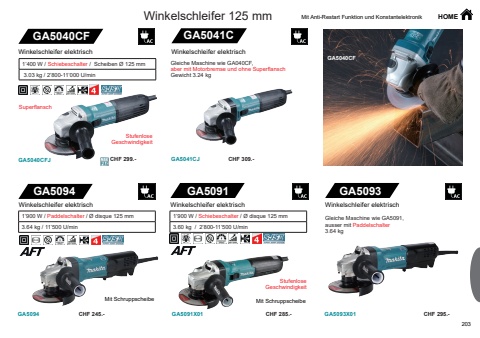 203GA5040CFGA5040CFJGA5041CGA5041CJGA5094GA5094GA5091GA5091X01GA5093GA5093X01GA5040CFCHF 299.- CHF 309.-CHF 245.- CHF 285.- CHF 295.-Winkelschleifer 125 mm HOME1%u2019400 W / Schiebeschalter / Scheiben %u00d8 125 mm  3.03 kg / 2%u2019800-11%u2019000 U/minWinkelschleifer elektrischSuperflanschStufenloseGeschwindigkeit1%u2019900 W / Paddelschalter / %u00d8 disque 125 mm3.64 kg / 11%u2019500 U/minWinkelschleifer elektrisch Winkelschleifer elektrisch1%u2019900 W / Schiebeschalter / %u00d8 disque 125 mm3.60 kg / 2%u2019800-11%u2019500 U/minStufenloseGeschwindigkeitMit Schruppscheibe Mit SchruppscheibeMit Anti-Restart Funktion und KonstantelektronikWinkelschleifer elektrischGleiche Maschine wie GA5091, ausser mit Paddelschalter 3.64 kgGleiche Maschine wie GA040CF, aber mit Motorbremse und ohne SuperflanschGewicht 3.24 kgWinkelschleifer elektrisch