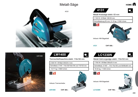 20941314131LW1400 LC1230NLW1400 LC1230N4131LW1400CHF 505.-CHF 365.- CHF 799.-Metall-S%u00e4ge HOME1%u2019100 W / %u00d8 Blatt 185/30 mmSchnittleistung 63 mm / 5.10 kg / 3%u2019500 U/minMetall-Kreiss%u00e4ge elektr. 63 mm1%u2019750 W / %u00d8 Blatt 305x25.4 mmSchnittleist. 0%u00b0/45%u00b0 : 115/ 75x150 und 90/85x85 mm19.50 kg / 1%u2019300 U/minMetall-Gehrungss%u00e4ge elektr. 115x150 mm2%u2019200 W / %u00d8 Blatt 355/25.4 mmSchnittleist. 0%u00b0/45%u00b0: 115x130/102x194 und 115/103 mm 18.77 kg / 3%u2019800 U/minTrennschleifmaschine elektr. 115x130 mmInklusiv HM-S%u00e4geblattInklusiv TrennscheibeInklusiv HM-S%u00e4geblatt