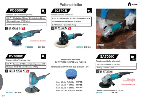 214PO5000CPO5000C9237CB9237CBPV7000CPV7000CSA7000CSA7000CSA7000CCHF 389.- CHF 289.-CHF 359.-CHF 63.-CHF 63.-CHF 63.-CHF 63.-CHF 295.-HOMEExzenter- und Rotationspolierer 900 W / %u00d8 Polierteller 125 mm / %u00d8 Schwingkreis 5.5 mmSchwingzahl max. 13%u2019600 U/min 0-780 t/min / Gewicht 3.28 kgPolierschleiferzuschaltbare RotationPoliermaschine elektrisch1%u2019200 W / %u00d8 Polierteller 165 mm / Spindelgewinde M14F%u00fcr Schw%u00e4mme und Hauben %u00d8 180 mm0-3%u2019200 U/min / Gewicht 3.95 kg900 W / Scheiben-%u00d8 180 mm / Spindelgewinde M14Drehzahl 600-2%u2019100 /min / Gewicht 2.48 kgTellerschleifer-B%u00fcrstmaschineKorn 46 Art. P-81094Korn 60 Art. P-81103Korn 80 Art. P-81119Korn 120 Art. P-81125Optionales Zubeh%u00f6rf%u00fcr PV7000C, 9237CB und PV001GTellerb%u00fcrsten %u00d8 150 mm aus Silizium - M14Rotationsschleifer elektrisch1%u2019600 W / Scheiben %u00d8 180 mm4.01 kg / 0-4%u2019000 U/minGeliefert mit Gummiteller %u00d8 170 mmStufenlose GeschwindigkeitKonstantelektronik