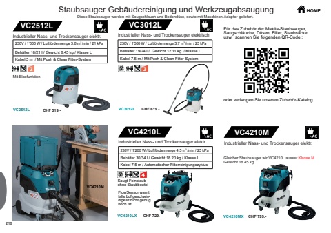 218VC4210L VC4210MVC4210LX VC4210MXVC4210MVC2512LVC2512LVC3012LVC3012LCHF 729.- CHF 799.-CHF 319.- CHF 619.-HOMEIndustrieller Nass- und Trockensauger elektr.230V / 1%u2019200 W / Luftf%u00f6rdermenge 4.5 m3 /min / 25 kPaBeh%u00e4lter 30/34 l / Gewicht 18.20 kg / Klasse LKabel 7.5 m / Automatischer FilterreinigungszyklusIndustrieller Nass- und Trockensauger elektr.Saugt Feinstaub ohne StaubbeutelStaubsauger Geb%u00e4udereinigung und WerkzeugabsaugungDiese Staubsauger werden mit Saugschlauch und Bodend%u00fcse, sowie mit Maschinen-Adapter geliefert.Gleicher Staubsauger wir VC4210L ausser Klasse MGewicht 18.45 kgFlowSensor warntfalls Luftgeschwindigkeit nicht genug hoch istMit BlasfunktionIndustrieller Nass- und Trockensauger elektr.230V / 1%u2019000 W / Luftf%u00f6rdermenge 3.6 m3 /min / 21 kPa Beh%u00e4lter 18/21 l / Gewicht 8.45 kg / Klasse LKabel 5 m / Mit Push & Clean Filter-System Industrieller Nass- und Trockensauger elektrisch230V / 1%u2019500 W / Luftf%u00f6rdermenge 3.7 m3 /min / 25 kPaBeh%u00e4lter 19/24 l / Gewicht 12.11 kg / Klasse LKabel 7.5 m / Mit Push & Clean Filter-SystemF%u00fcr das Zubeh%u00f6r der Makita-Staubsauger, Saugschl%u00e4uche, D%u00fcsen, Filter, Staubs%u00e4cke, usw. scannen Sie folgenden QR-Code : oder verlangen Sie unseren Zubeh%u00f6r-Katalog