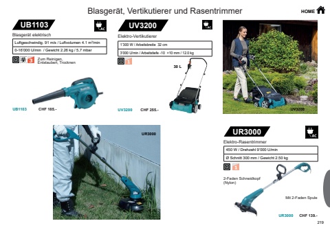 219UB1103UB110330 LUV3200 UV3200UV3200UR3000UR3000UR3000CHF 185.- CHF 255.-CHF 139.-Blasger%u00e4t, Vertikutierer und Rasentrimmer HOMEZum Reinigen, Entstauben, TrocknenBlasger%u00e4t elektrischLuftgeschwindig. 91 m/s / Luftvolumen 4.1 m3/min0-16%u2019000 U/min / Gewicht 2.26 kg / 5,7 mbarElektro-Vertikutierer1%u2019300 W / Arbeitsbreite 32 cm3%u2019000 U/min / Arbeitstiefe -10 +10 mm / 12.0 kg2-Faden Schneidkopf (Nylon)450 W / Drehzahl 9%u2019000 U/min %u00d8 Schnitt 300 mm / Gewicht 2.50 kgElektro-RasentrimmerMit 2-Faden SpuleRasentrimmer und Heckenscheren