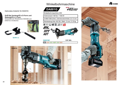 HOME22DA001GZDA001G191P11-3Ah Ah 2.5 / 4.0 / 4.0F / 5.0 / 8.0 DA001GDA001GOptionales Zubeh%u00f6r f%u00fcr DA001GGriff-Set Vordergriff in D-Form und Seitengriff in L-FormVerwandelt die Winkelbohrer DDA460 und DA001G in Erdbohrer.Winkelbohrmaschine 40VDrehmoment 136 Nm / 1%u2019350 W0-400/1%u2019500 U/min / Zahnkranzbohrfutter 2.0-13 mmBohrleistung Holz: 65/159 / Stahl: 13 mm / 5.10 kgWinkelbohrmaschineCHF 699.-