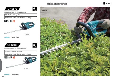 220UH5570UH6580UH5570UH6580UH5570CHF 299.-CHF 219.-HOME3 GriffeHeckenschere 55 cm elektrischHeckenschere 65 cm elektrisch670 W / Schnittl%u00e4nge 65 cm3%u2019000 U/min / Max. %u00c4ste %u00d8 18 mm / 4.40 kg550 W / Schnittl%u00e4nge 55 cm3%u2019200 U/min / Max. %u00c4ste %u00d8 18 mm / 3.76 kg3 GriffeHeckenscheren