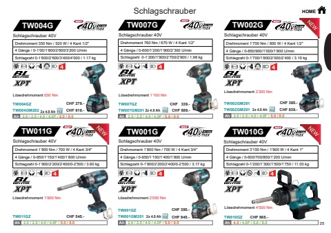 HOME25TW004GZTW004GM202 2x 4.0 AhTW004GTW007GZTW007GM201 2x 4.0 AhTW007GTW001GZTW001GM201 2x 4.0 AhTW001GTW002GM201TW002GM201 2x 4.0 AhTW002GTW010GTW010GZAh Ah 2.0 / 2.5 / 4.0 / 4.0F / 5.0 / 8.0 Ah Ah 2.0 / 2.5 / 4.0 / 4.0F / 5.0 / 8.0 Ah Ah 2.0 / 2.5 / 4.0 / 4.0F / 5.0 / 8.0 Ah Ah 2.0 / 2.5 / 4.0 / 4.0F / 5.0 / 8.0 Ah Ah 4.0 / 4.0F / 5.0 / 8.0 TW011GZTW011GAh Ah 2.0 / 2.5 / 4.0 / 4.0F / 5.0 / 8.0 Drehmoment 350 Nm / 520 W / 4 Kant 1/2\4 G%u00e4nge / 0-1%u201900/1%u2019800/2%u2019600/3%u2019200 U/min Schlagzahl 0-1%u2019800/2%u2019600/3%u2019400/4%u2019000 / 1.17 kg Schlagschrauber 40VDrehmoment 760 Nm / 670 W / 4 Kant 1/2\4 G%u00e4nge / 0-600/1%u2019200/1%u2019900/2%u2019300 U/minSchlagzahl 0-1%u2019200/1%u2019900/2%u2019700/2%u2019900 / 1.98 kg Schlagschrauber 40VSchlagschrauberDrehmoment 1%u2019800 Nm / 700 W / 4 Kant 3/4\4 G%u00e4nge / 0-950/1%u2019150/1%u2019400/1%u2019800 U/min Schlagzahl 0-1%u2019900/2%u2019200/2%u2019400/0-2%u2019500 / 3.17 kgSchlagschrauber 40VSchlagschrauber 40VDrehmoment 1%u2019700 Nm / 850 W / 4 Kant 1/2\4 G%u00e4nge / 0-850/900/1%u2019000/1%u2019800 U/min Schlagzahl 0-1%u2019700/1%u2019800/2%u2019000/2%u2019400 / 3.16 kgSchlagschrauber 40VL%u00f6sedrehmoment 2%u2019050 NmL%u00f6sedrehmoment 2%u2019200 NmL%u00f6sedrehmoment 630 Nm L%u00f6sedrehmoment 1%u2019100 NmDrehmoment 3%u2019150 Nm / 1%u2019900 W / 4 Kant 1\4 G%u00e4nge / 0-600/700/850/1%u2019200 U/min Schlagzahl 0-1%u2019200/1%u2019300/1%u2019500/1%u2019750 / 11.03 kgL%u00f6sedrehmoment 4%u2019000 NmSchlagschrauber 40VDrehmoment 1%u2019800 Nm / 700 W / 4 Kant 3/4\4 G%u00e4nge / 0-950/1%u2019150/1%u2019400/1%u2019800 U/min Schlagzahl 0-1%u2019900/2%u2019200/2%u2019400/0-2%u2019500 / 3.60 kgL%u00f6sedrehmoment 1%u2019900 NmCHF 279.-CHF 819.-CHF 339.-CHF 889.-CHF 395.-CHF 945.-CHF 365.-CHF 839.-CHF 545.- CHF 865.-